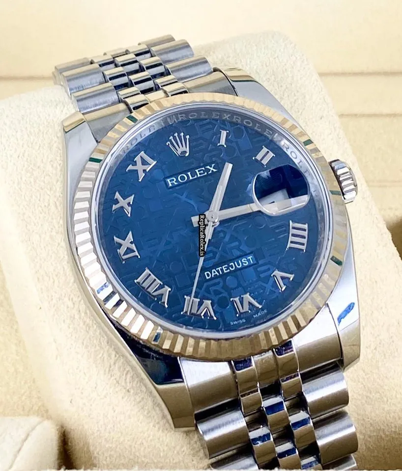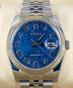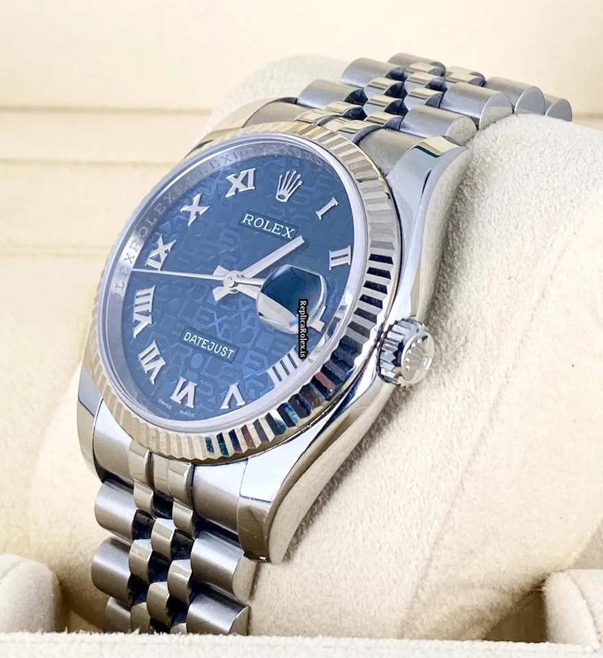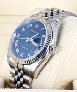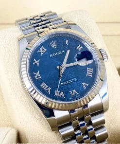 Tags: 10m atm, 116234, 31 jewels, 36mm case diameter, 48h power reserve, automatic movement, blue dial, caliber 3135, fold clasp, mens watches, sapphire crystal, steel bracelet color, steel bracelet material, steel clasp material, unisex watches, white gold bezel material, white gold case material