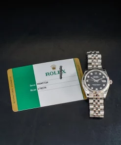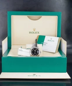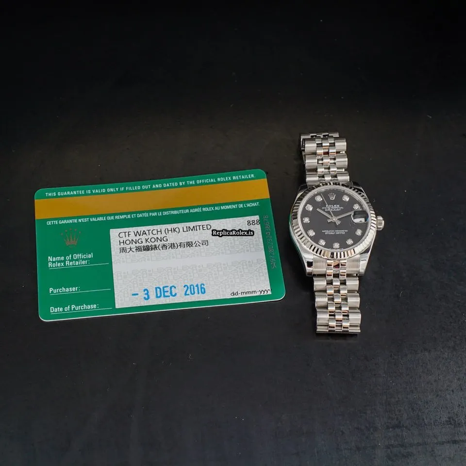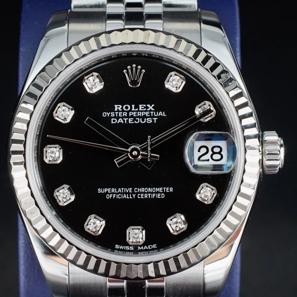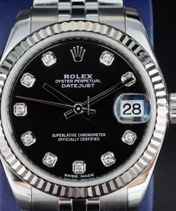 Tags: 10m atm, 178274, 31 jewels, 31mm case diameter, 48h power reserve, automatic movement, black dial, caliber 2235, fold clasp, sapphire crystal, steel bracelet color, steel bracelet material, steel case material, steel clasp material, white gold bezel material, womens watches
