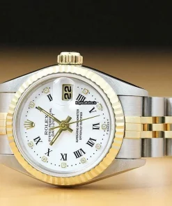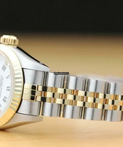 Tags: 13mm lug width, 165mm bracelet length, 26mm case diameter, 29 jewels, 69173, automatic movement, caliber 2135, gold/steel bracelet color, gold/steel bracelet material, roman numerals, sapphire crystal, steel case material, white dial, womens watches, yellow gold bezel material