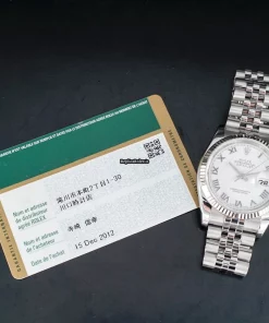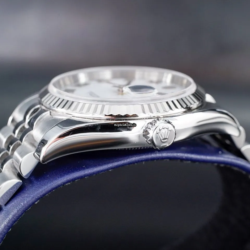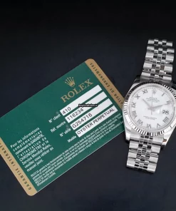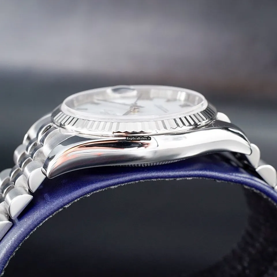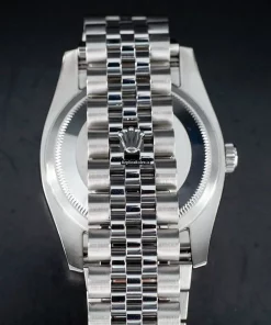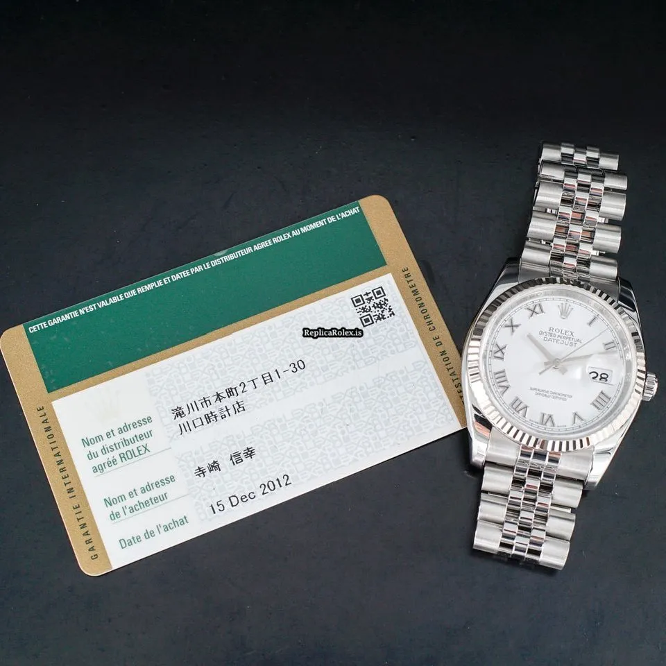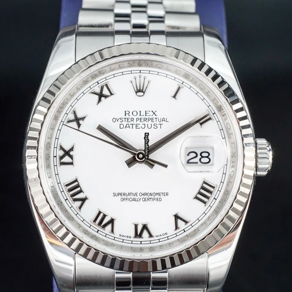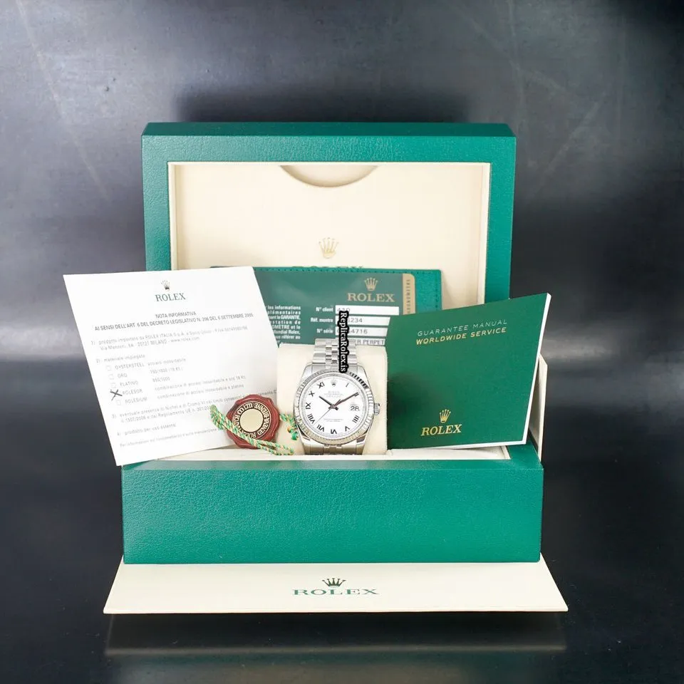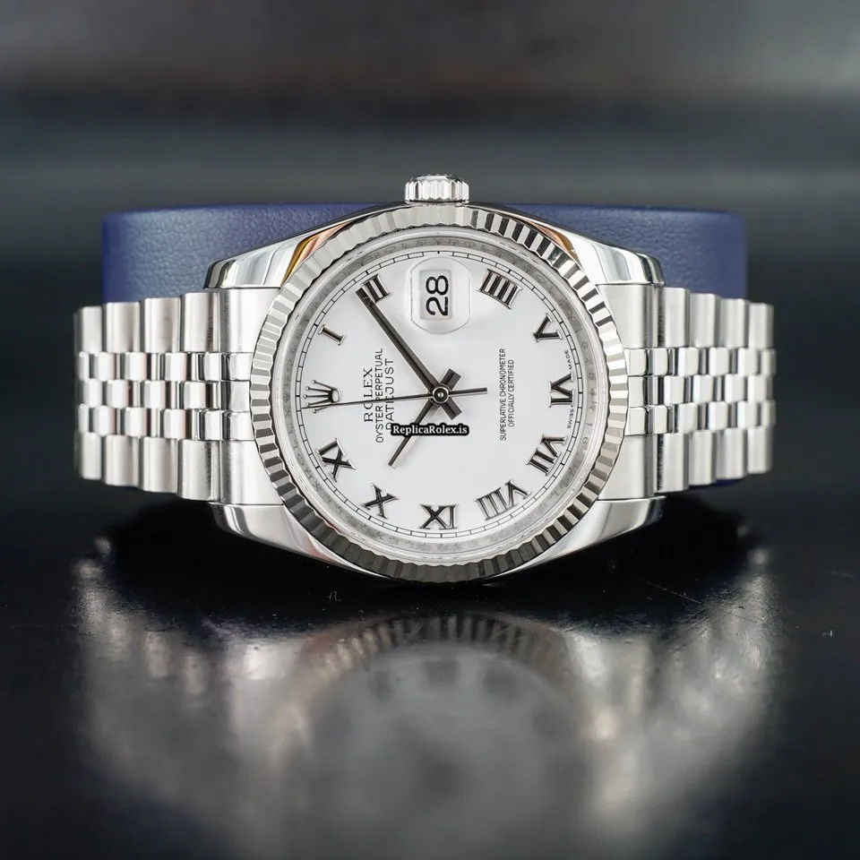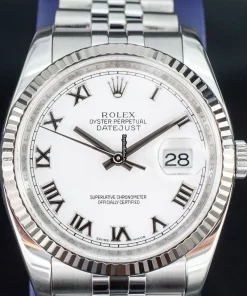 Tags: 10m atm, 116234, 31 jewels, 36mm case diameter, 48h power reserve, automatic movement, caliber 3135, fold clasp, mens watches, roman numerals, sapphire crystal, steel bracelet color, steel bracelet material, steel case material, steel clasp material, unisex watches, white dial, white gold bezel material