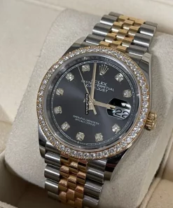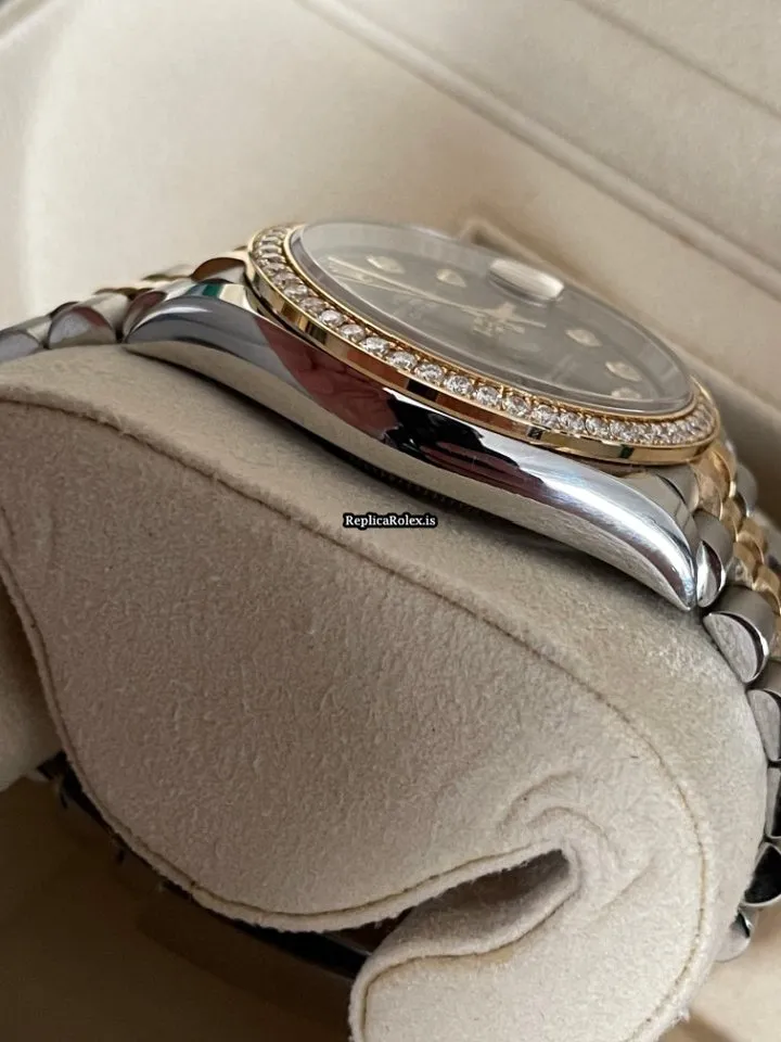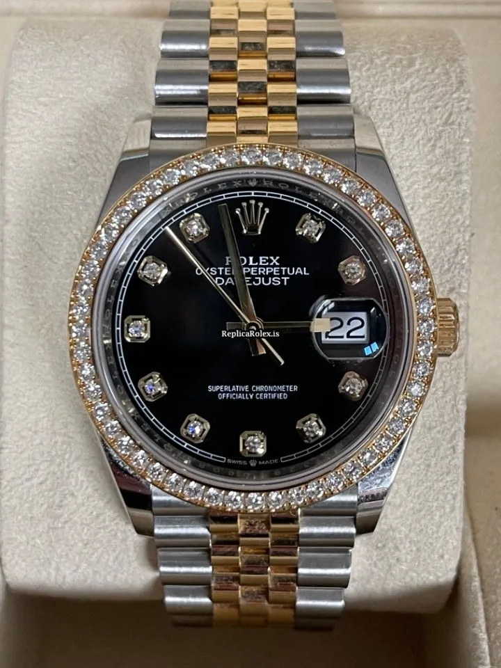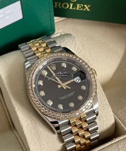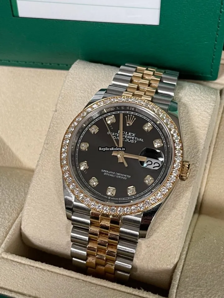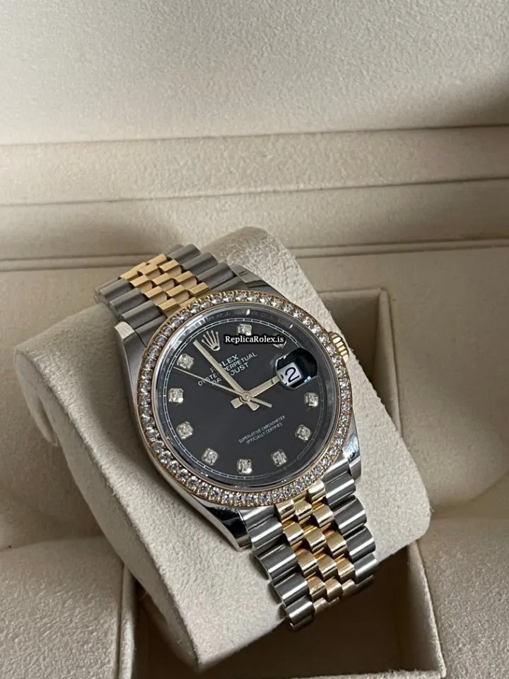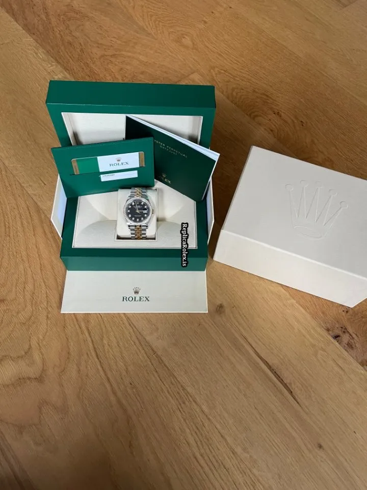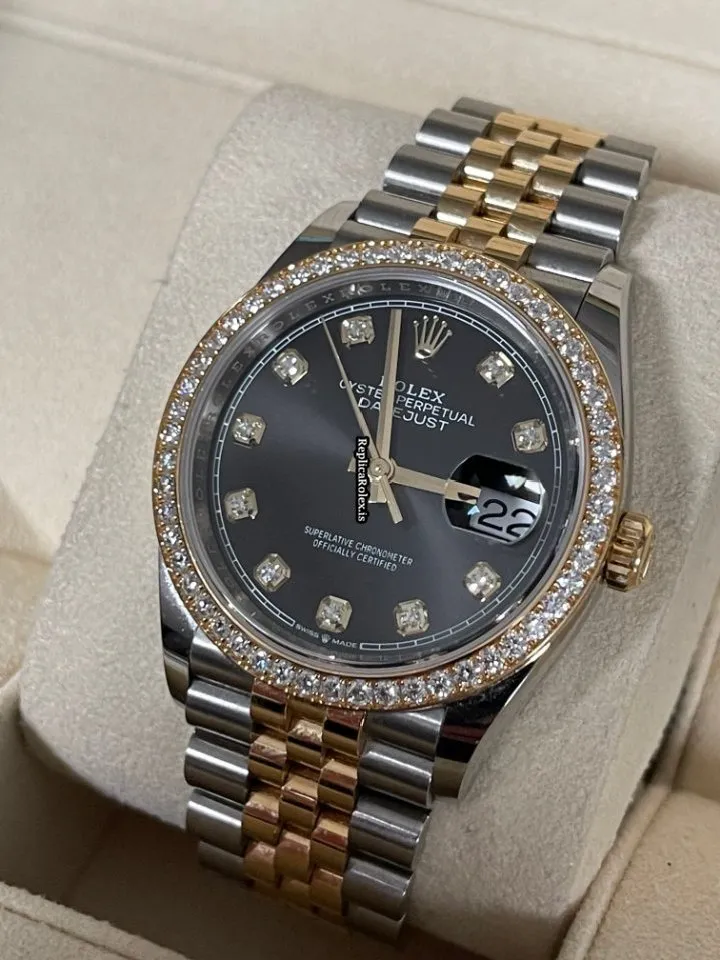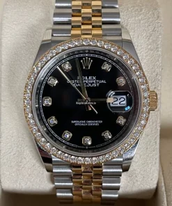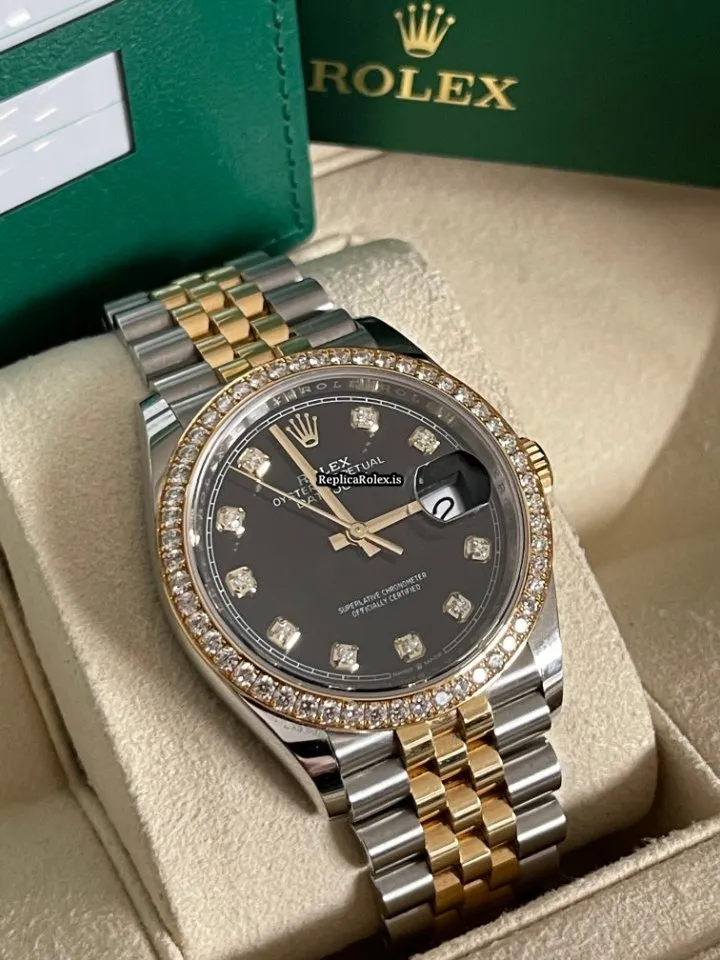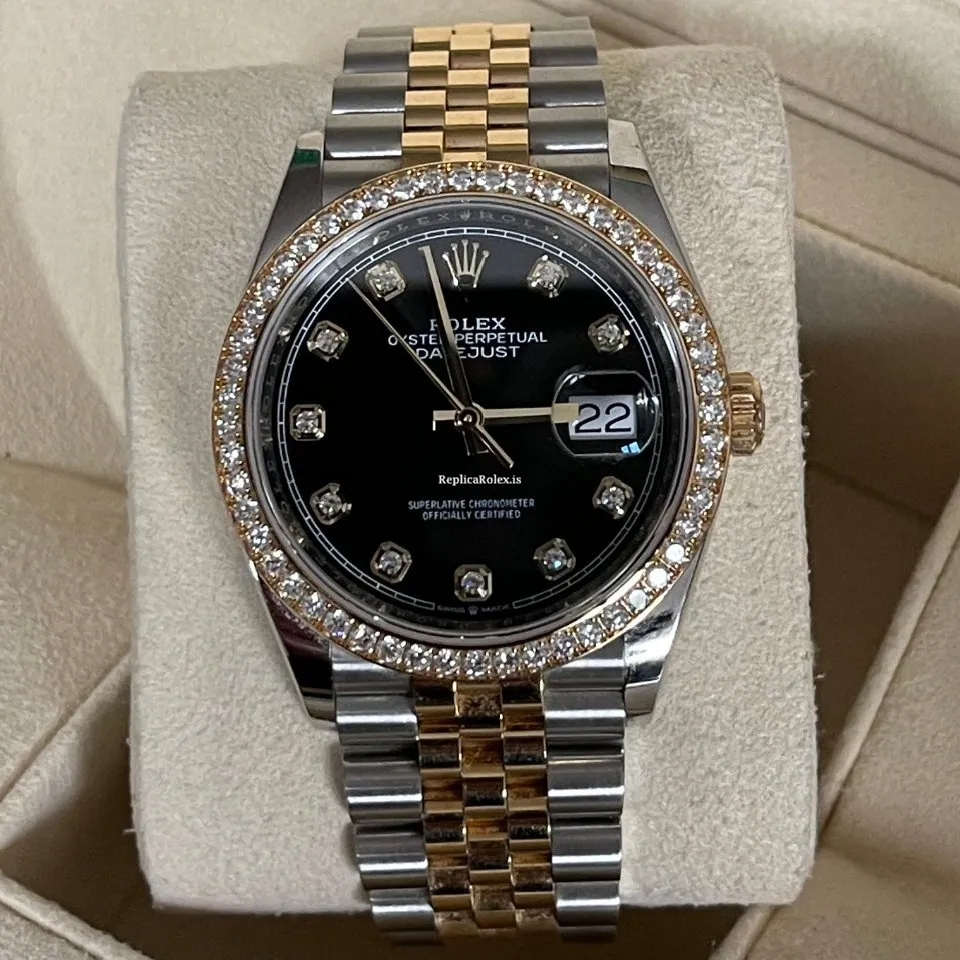 Tags: 10m atm, 126283rbr, 31 jewels, 36mm case diameter, 70h power reserve, automatic movement, black dial, caliber 3135, caliber 3235, fold clasp, gold/steel bracelet color, gold/steel bracelet material, gold/steel case material, gold/steel clasp material, mens watches, no numerals, sapphire crystal, unisex watches, yellow gold bezel material