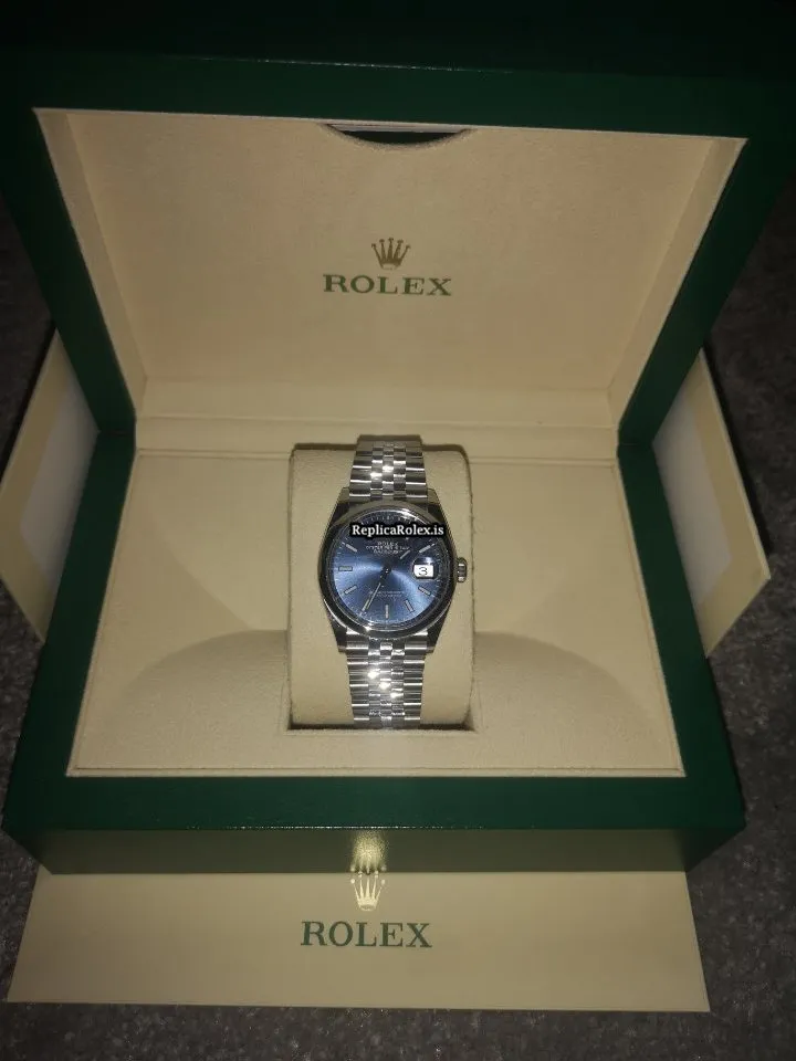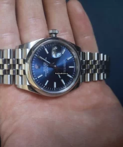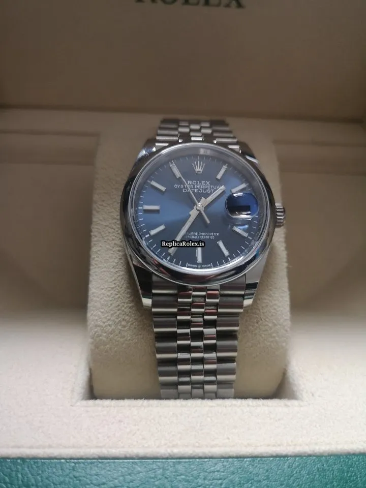 Tags: 10m atm, 126200, 31 jewels, 36mm case diameter, 70h power reserve, automatic movement, blue dial, caliber 3135, caliber 3235, fold clasp, mens watches, no numerals, sapphire crystal, steel bezel material, steel bracelet color, steel bracelet material, steel case material, steel clasp material, unisex watches