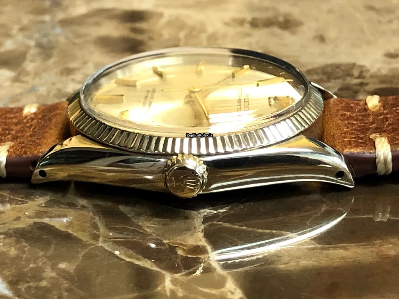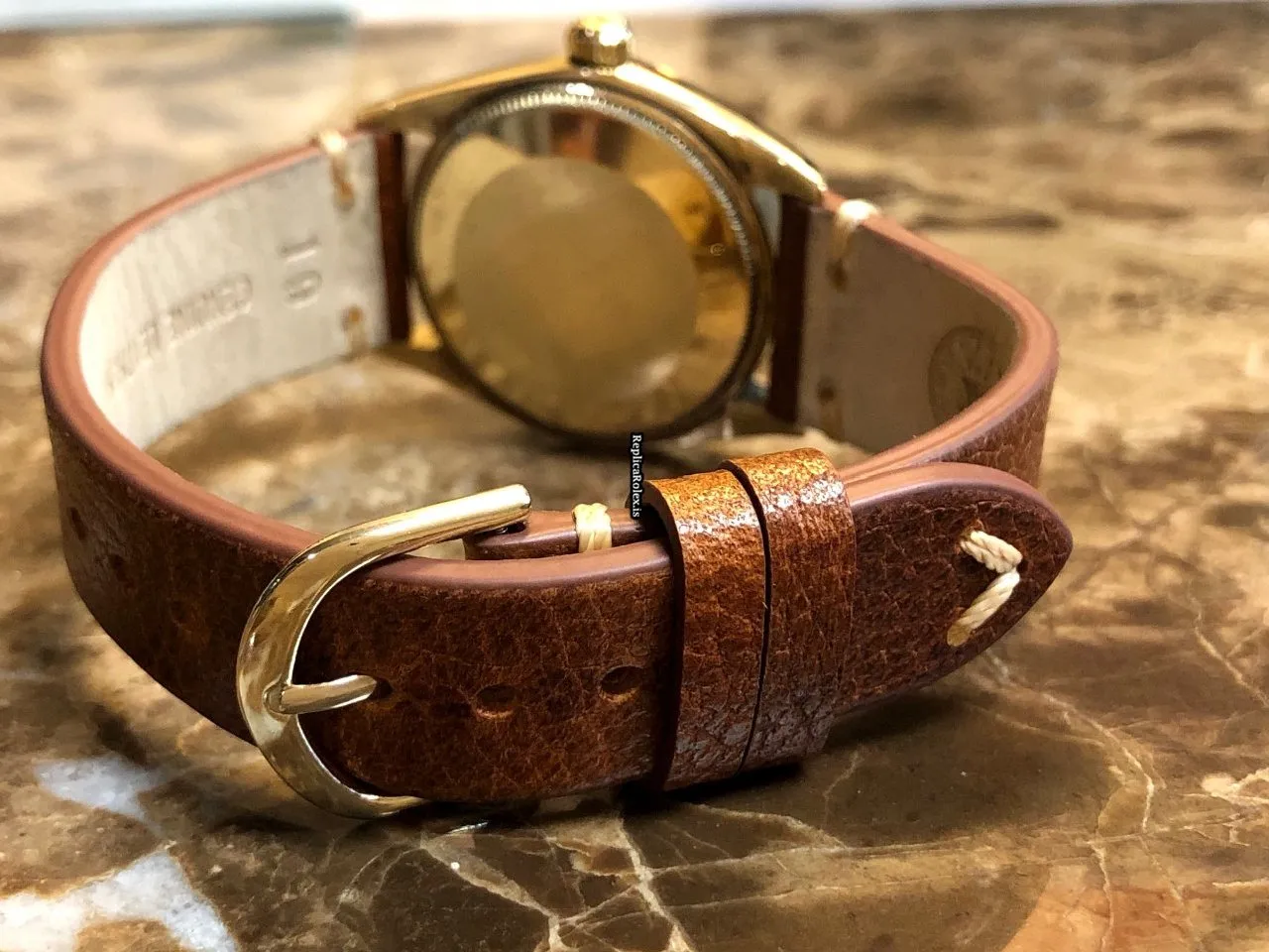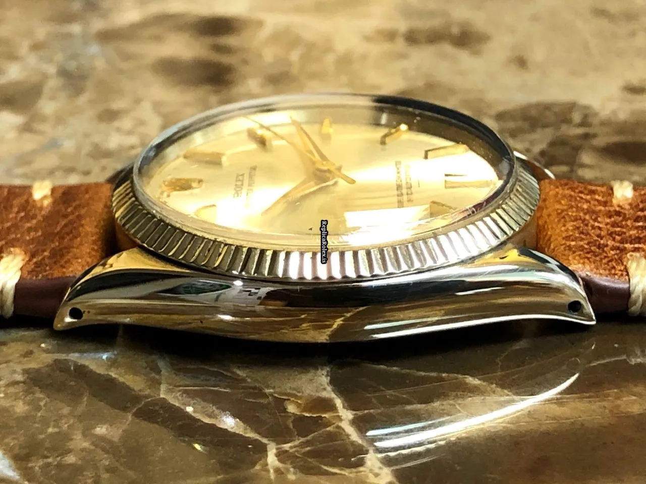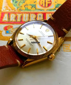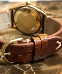 Tags: 1005, 11.5mm, 19mm lug width, 26 jewels, 34mm case diameter, automatic movement, brown bracelet color, buckle clasp, caliber 1560, leather bracelet material, mens watches, no numerals, plexiglass crystal, silver dial, steel clasp material, unisex watches, yellow gold bezel material, yellow gold case material