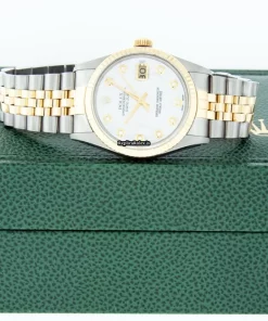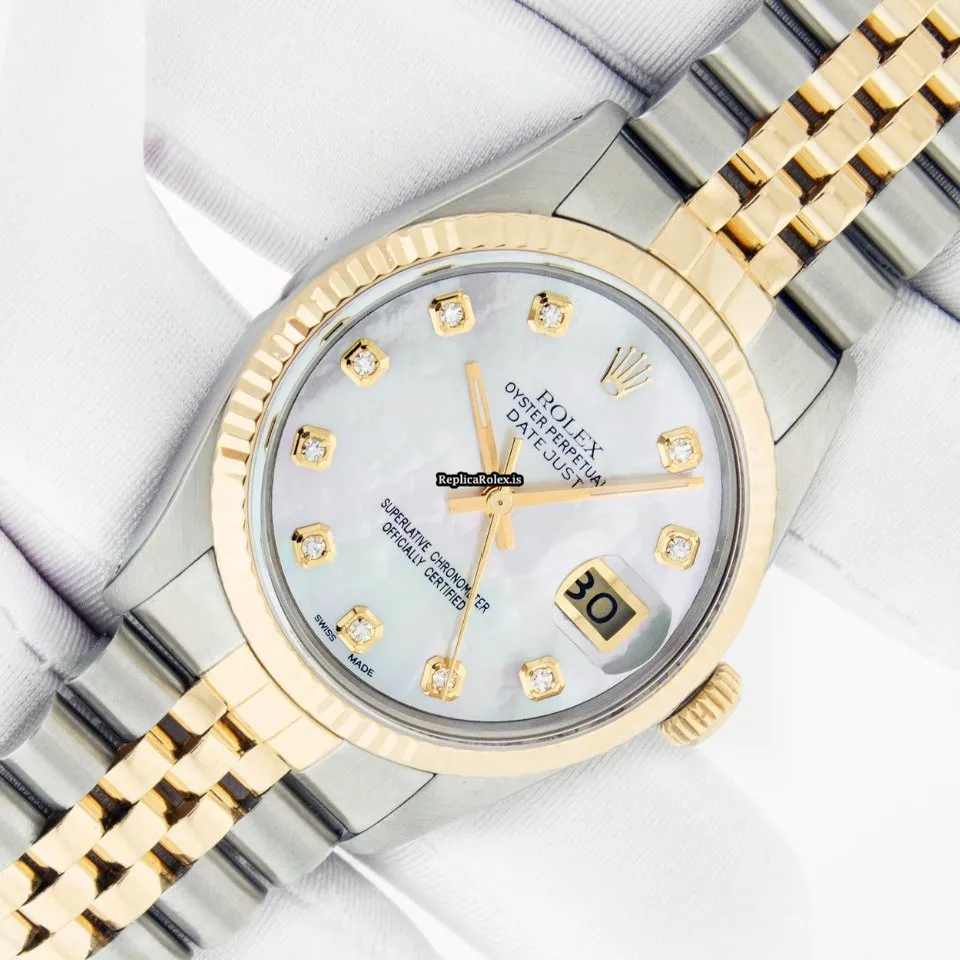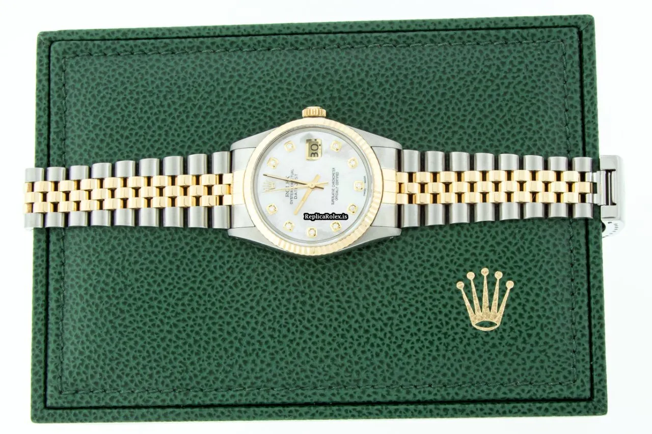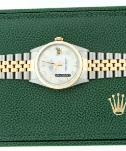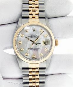Tags: 16013, 20mm lug width, 31 jewels, 36mm case diameter, 48h power reserve, automatic movement, caliber 3135, fold clasp, gold/steel bracelet color, gold/steel bracelet material, gold/steel case material, mens watches, mother of pearl dial, plastic crystal, steel clasp material, unisex watches, yellow gold bezel material