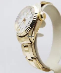 Tags: 10m atm, 26mm case diameter, 28 jewels, 42h power reserve, 6917, automatic movement, caliber 2135, fold clasp, no numerals, plexiglass crystal, white dial, womens watches, yellow gold bezel material, yellow gold case material