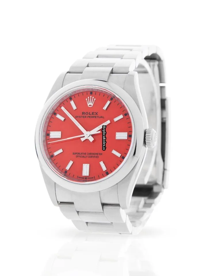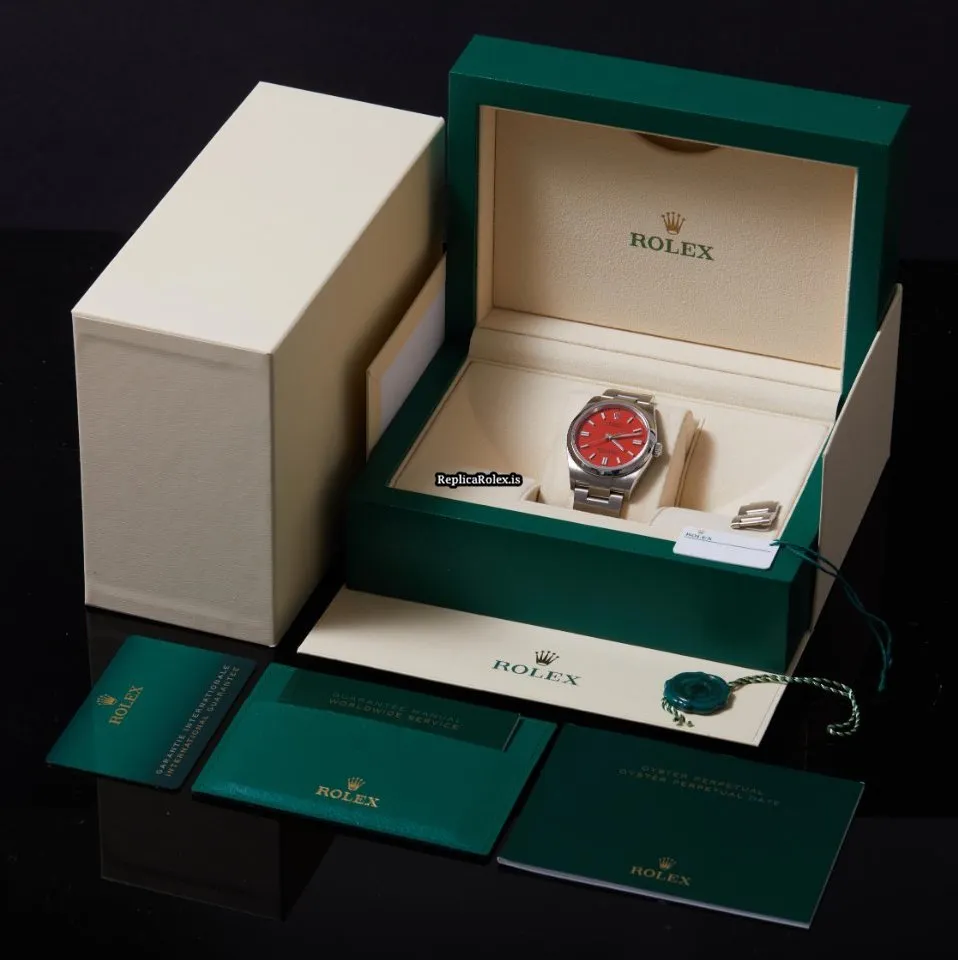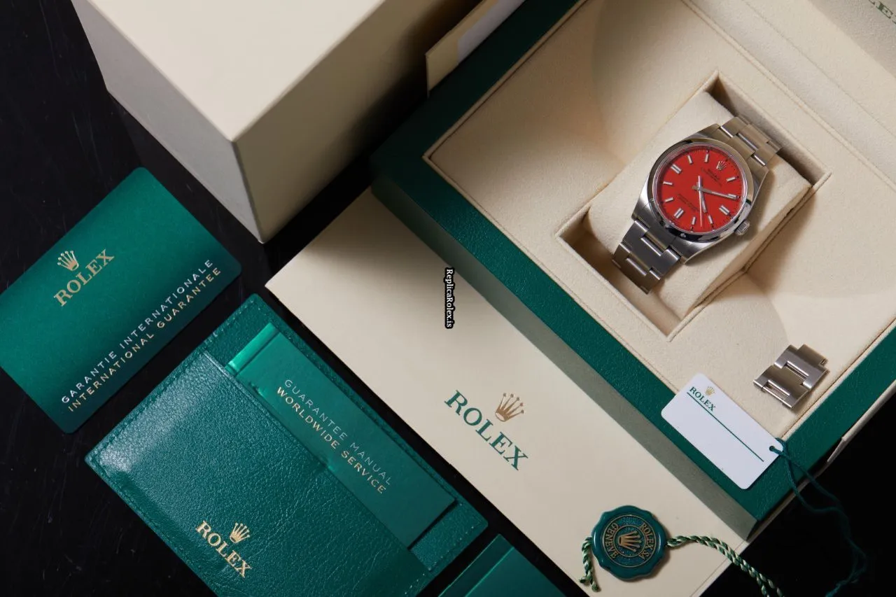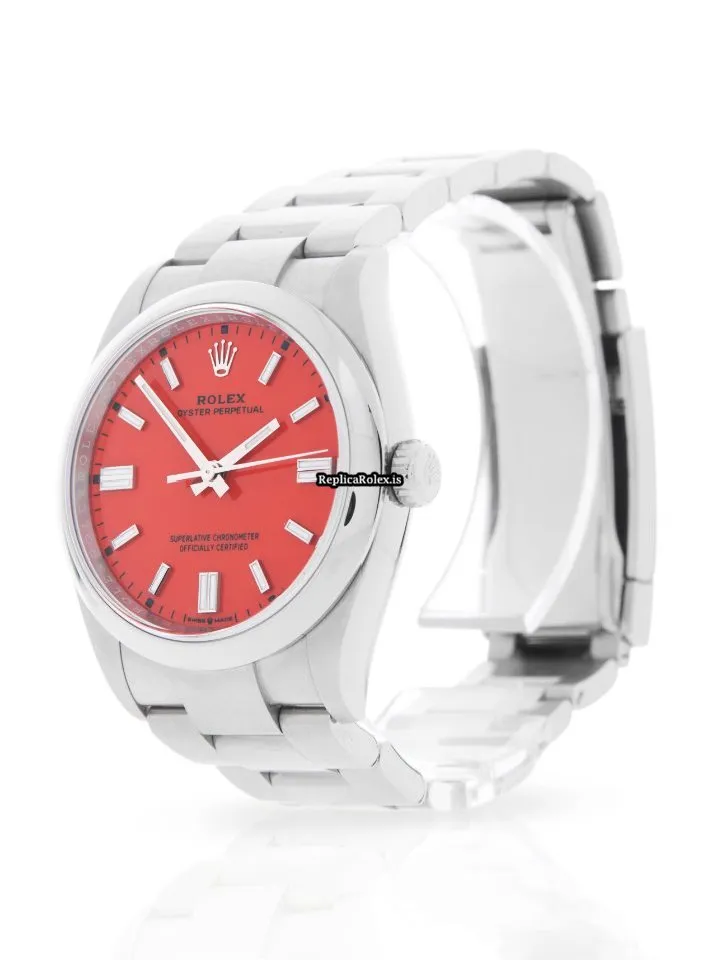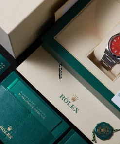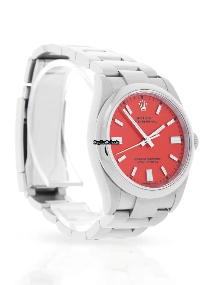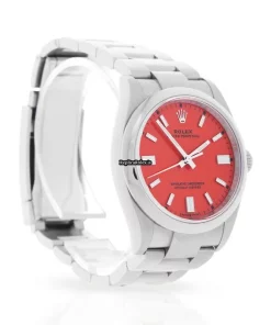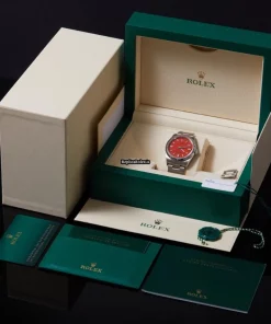 Tags: 10m atm, 126000, 31 jewels, 36mm case diameter, 70h power reserve, automatic movement, caliber 3230, fold clasp, mens watches, no numerals, red dial, sapphire crystal, steel bezel material, steel bracelet color, steel bracelet material, steel case material, steel clasp material, unisex watches