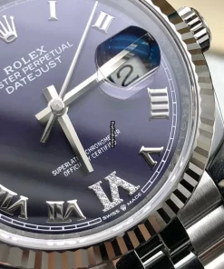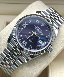 Tags: 10m atm, 126234, 31 jewels, 36mm case diameter, 70h power reserve, automatic movement, caliber 3135, caliber 3235, fold clasp, mens watches, no numerals, purple dial, sapphire crystal, steel bracelet color, steel bracelet material, steel case material, steel clasp material, unisex watches, white gold bezel material