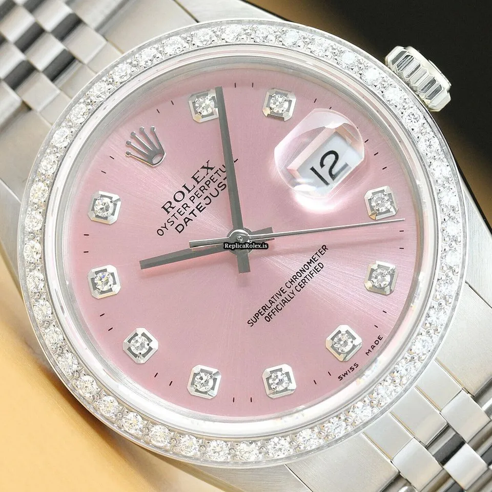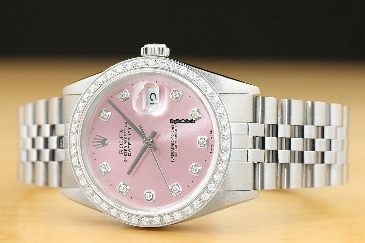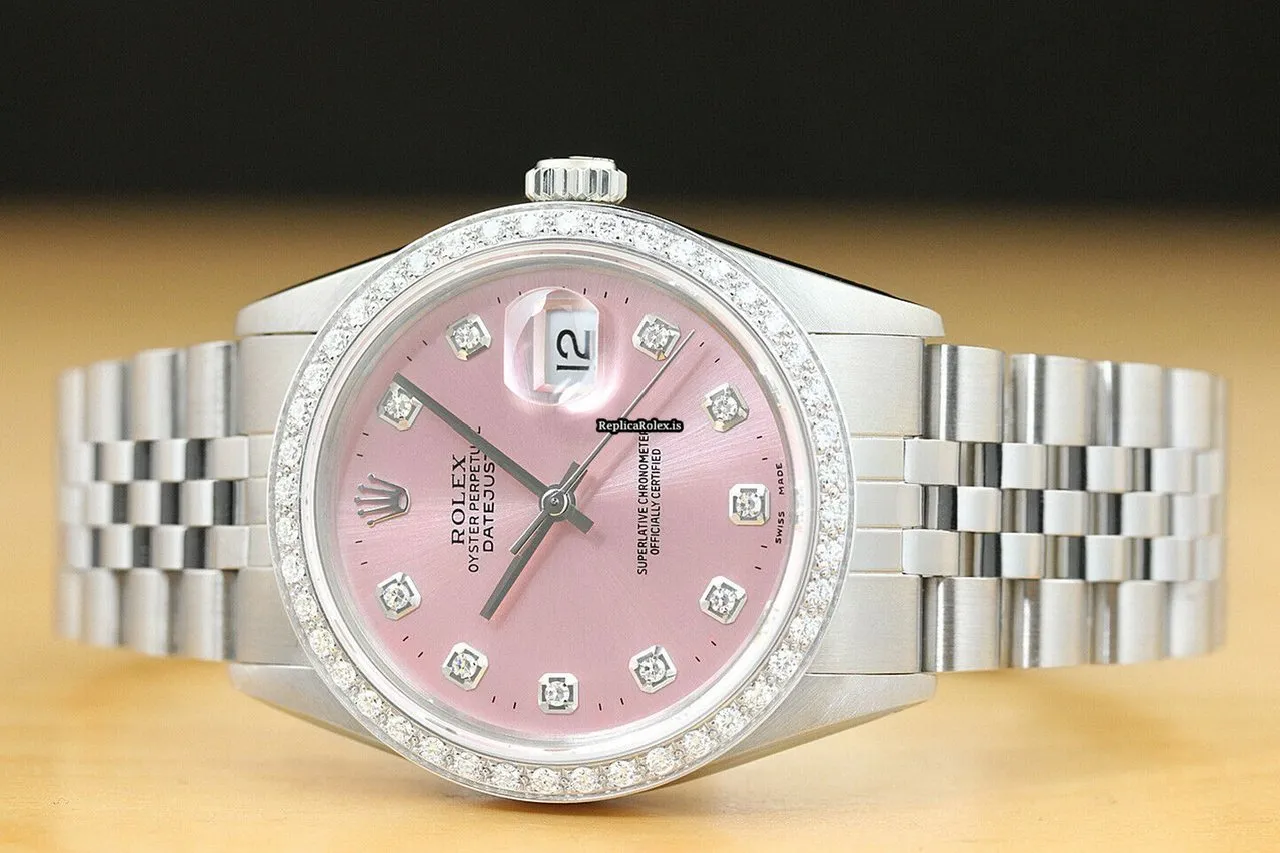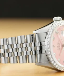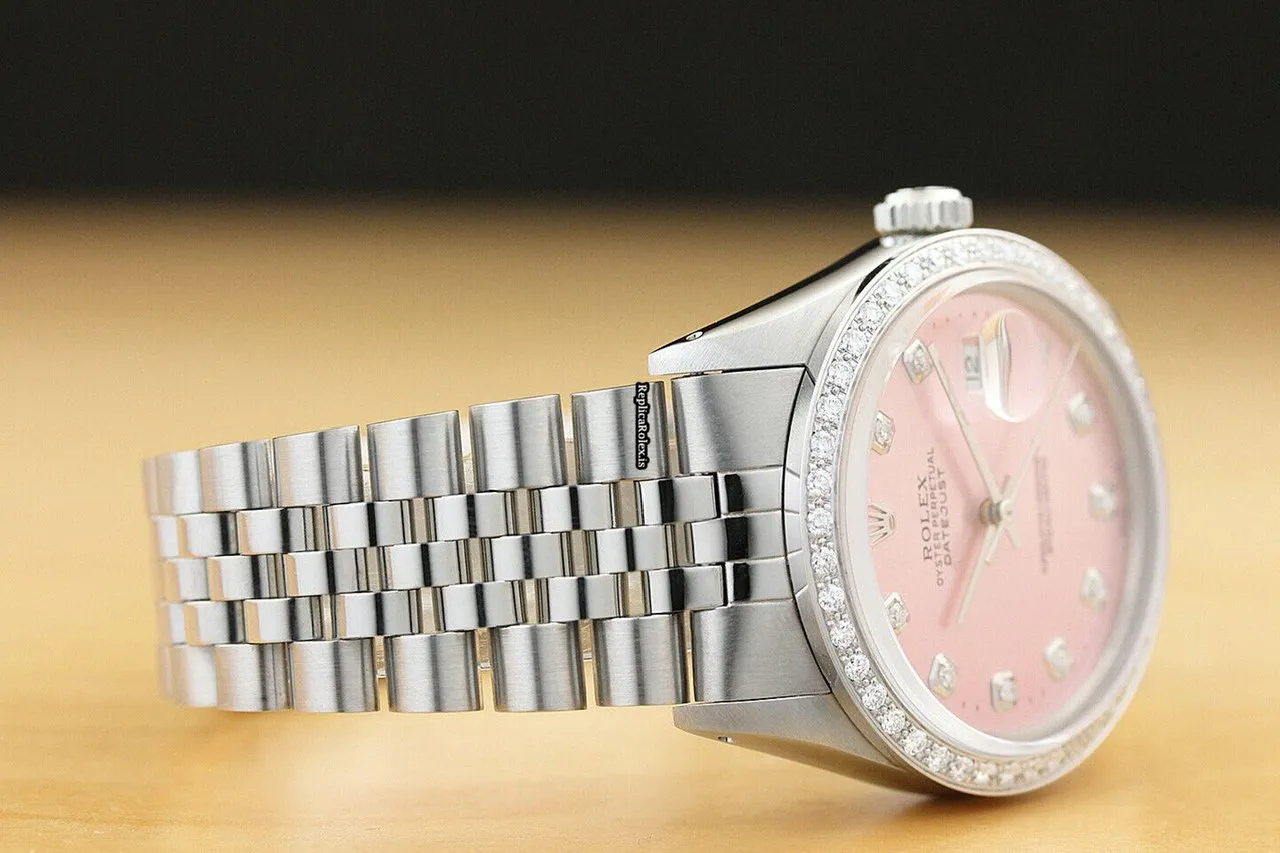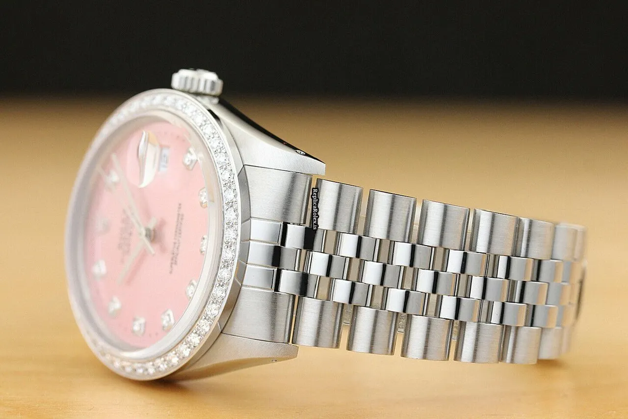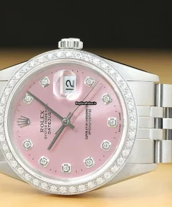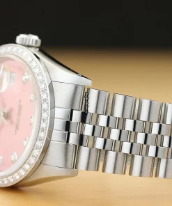 Tags: 16014, 191mm bracelet length, 20mm lug width, 27 jewels, 36mm case diameter, automatic movement, caliber 3035, mens watches, pink dial, sapphire crystal, steel bracelet color, steel bracelet material, steel case material, unisex watches, white gold bezel material