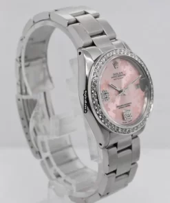 Tags: 10m atm, 28 jewels, 31mm case diameter, 48h power reserve, 6824, arabic numerals, automatic movement, caliber 2030, fold clasp, pink dial, plexiglass crystal, steel bezel material, steel bracelet color, steel bracelet material, steel case material, steel clasp material, womens watches
