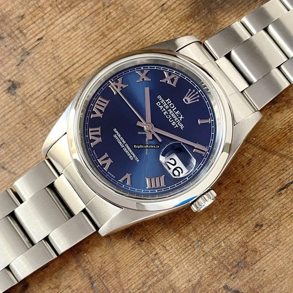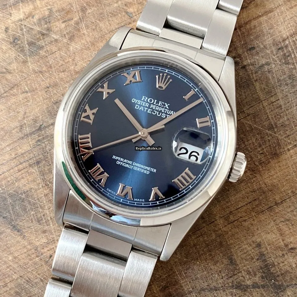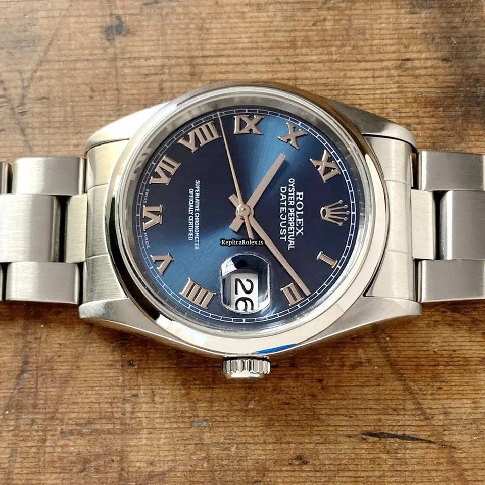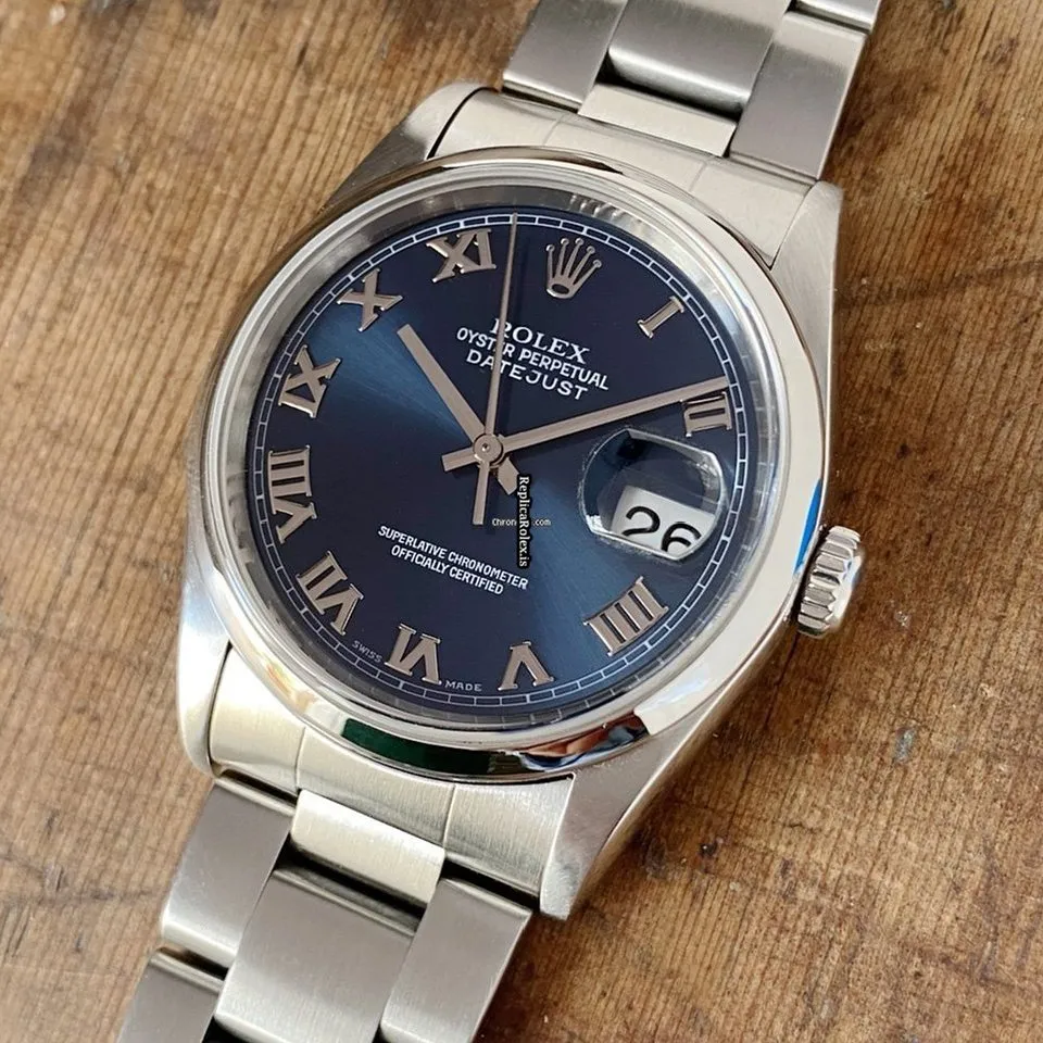 Tags: 10m atm, 116200, 31 jewels, 36mm case diameter, 48h power reserve, automatic movement, blue dial, caliber 3135, fold clasp, mens watches, roman numerals, sapphire crystal, steel bezel material, steel bracelet color, steel bracelet material, steel case material, steel clasp material, unisex watches
