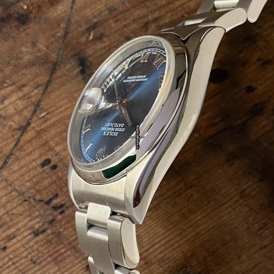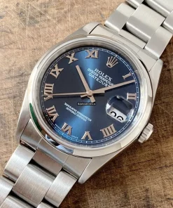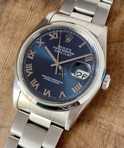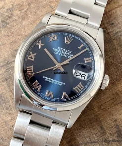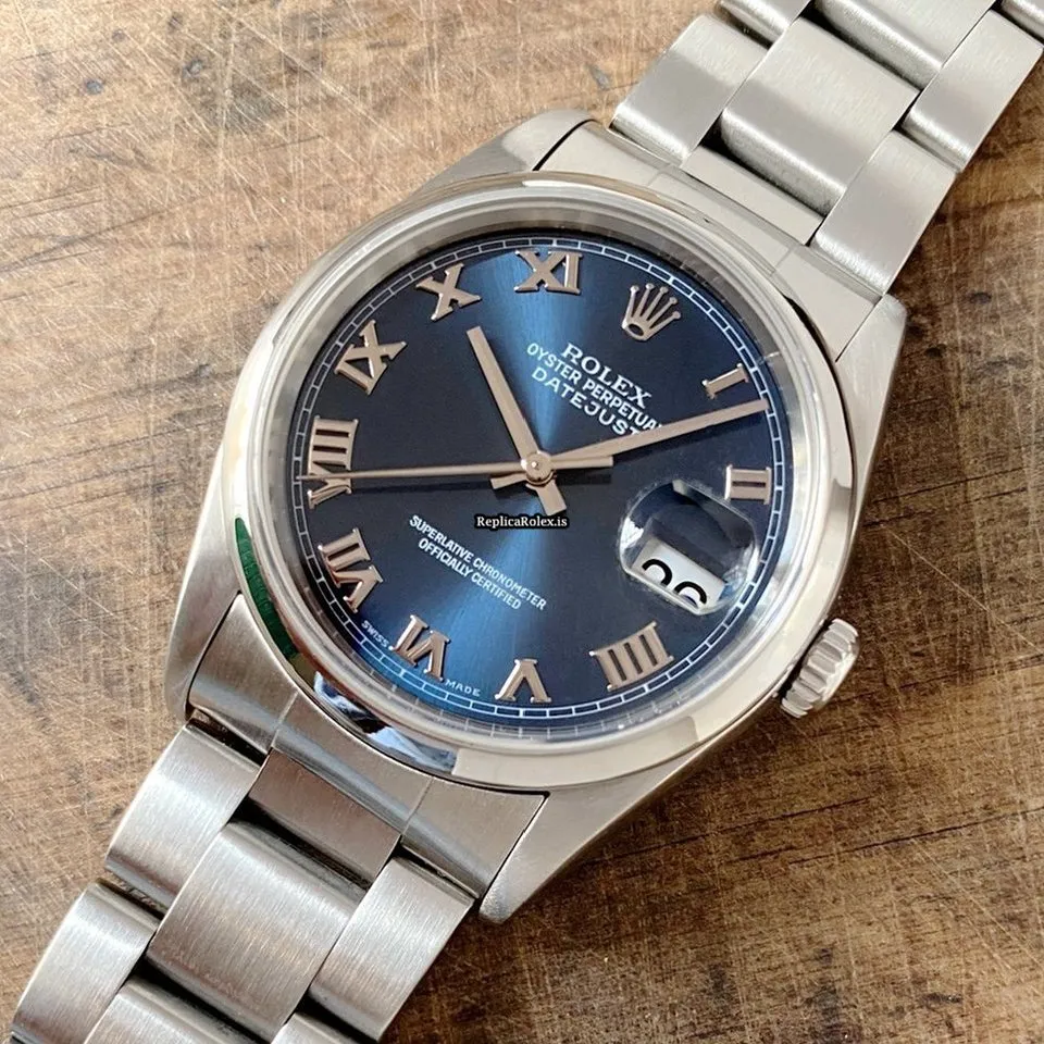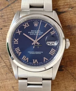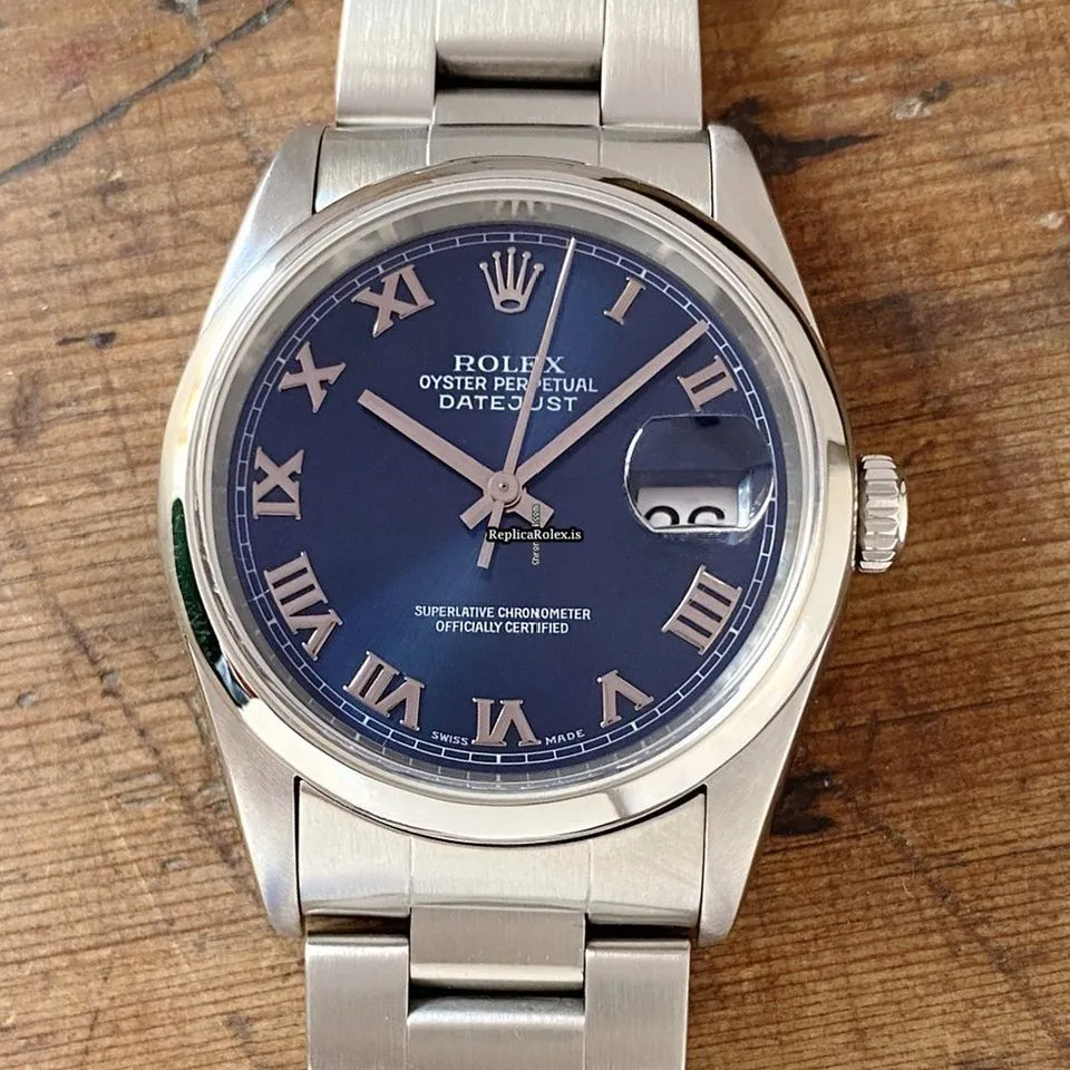 Tags: 10m atm, 116200, 31 jewels, 36mm case diameter, 48h power reserve, automatic movement, blue dial, caliber 3135, fold clasp, mens watches, roman numerals, sapphire crystal, steel bezel material, steel bracelet color, steel bracelet material, steel case material, steel clasp material, unisex watches