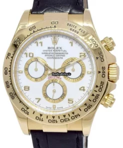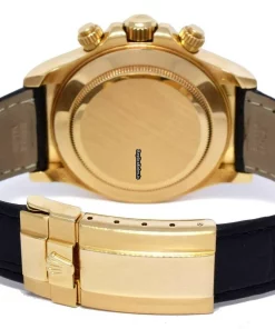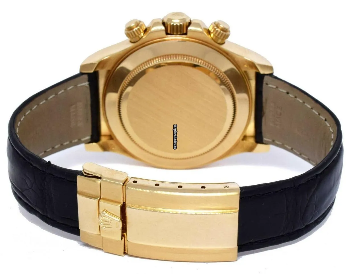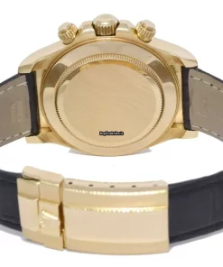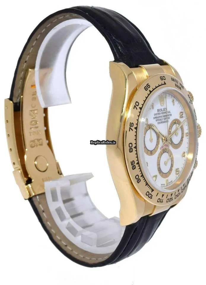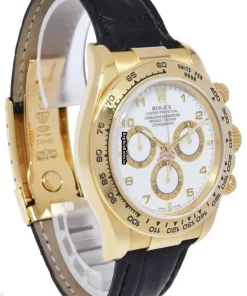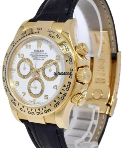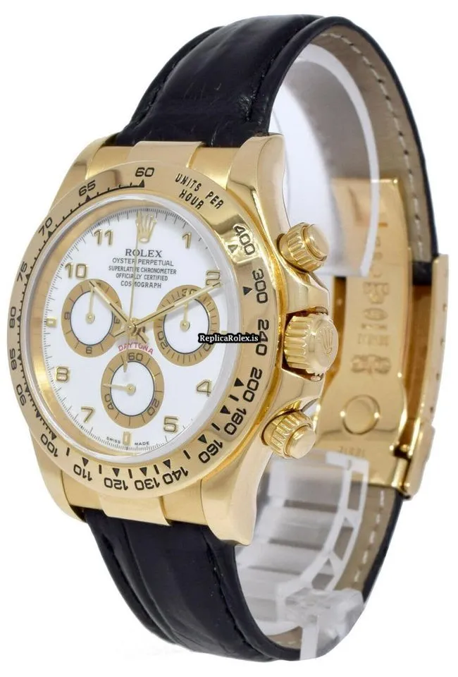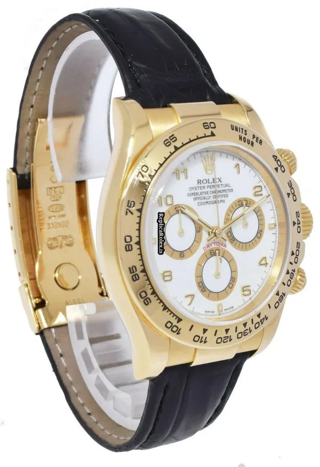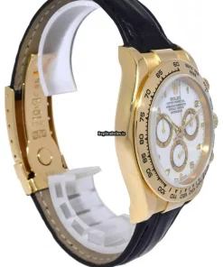 Tags: 116518, 40mm case diameter, arabic numerals, automatic movement, black bracelet color, fold clasp, leather bracelet material, white dial, yellow gold case material, yellow gold clasp material