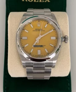 Tags: 10m atm, 126000, 31 jewels, 36mm case diameter, 70h power reserve, automatic movement, caliber 3230, fold clasp, mens watches, no numerals, sapphire crystal, steel bezel material, steel bracelet color, steel bracelet material, steel case material, steel clasp material, unisex watches, yellow dial