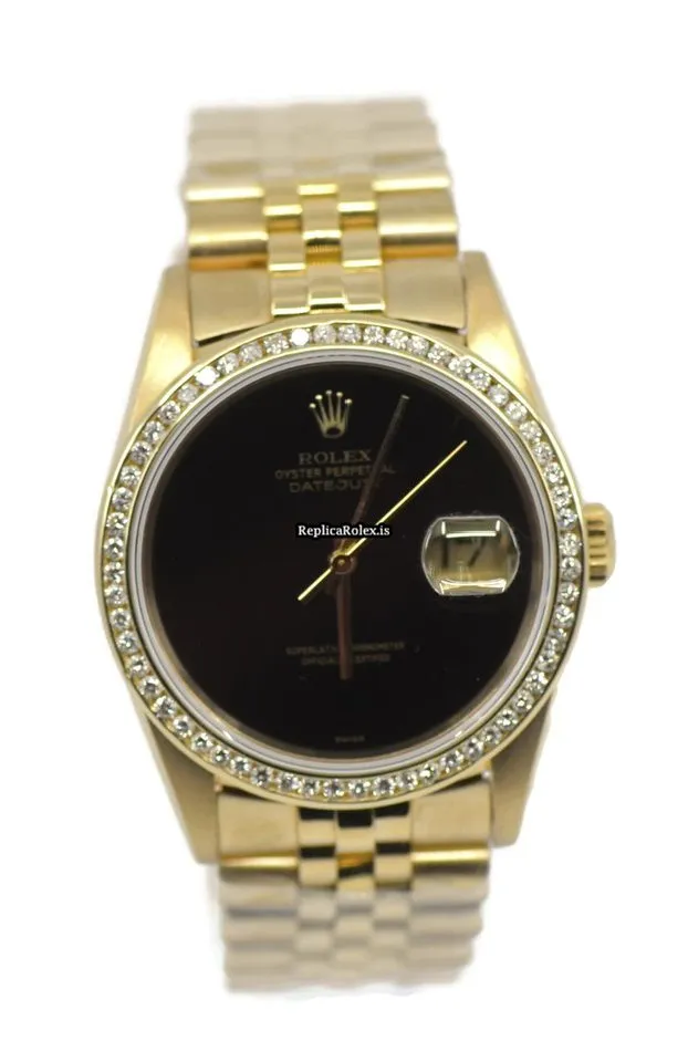 Tags: 10m atm, 16238, 31 jewels, 36mm case diameter, 48h power reserve, automatic movement, black dial, caliber 3135, gold bracelet color, mens watches, no numerals, sapphire crystal, unisex watches, yellow gold bezel material, yellow gold bracelet material, yellow gold case material, yellow gold clasp material