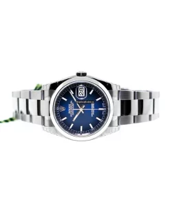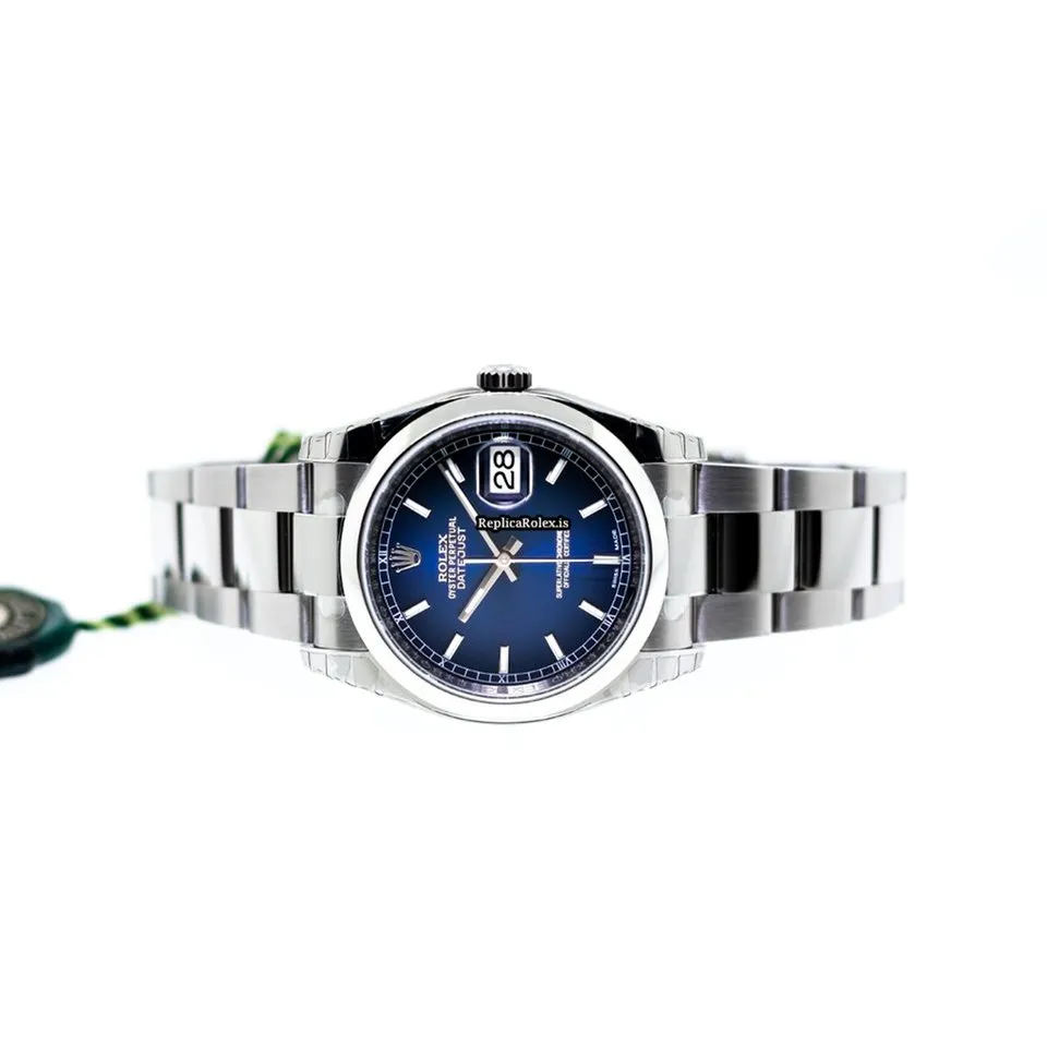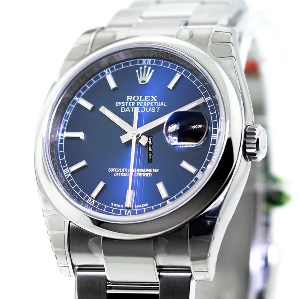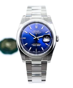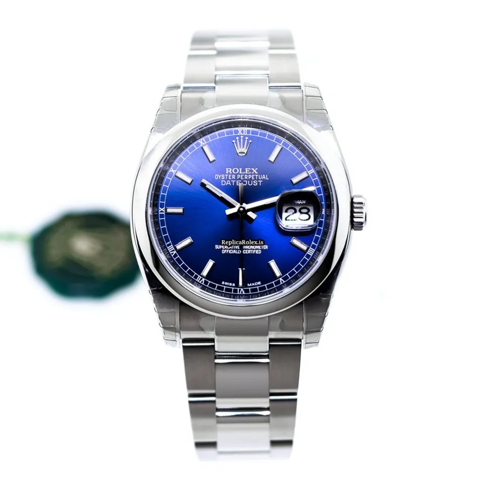 Tags: 10m atm, 116200, 31 jewels, 36mm case diameter, 48h power reserve, automatic movement, blue dial, caliber 3135, fold clasp, mens watches, no numerals, sapphire crystal, steel bezel material, steel bracelet color, steel bracelet material, steel case material, steel clasp material, unisex watches