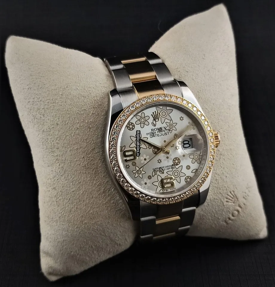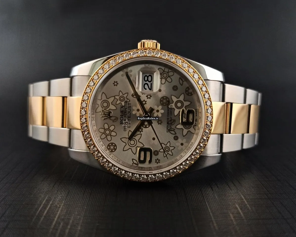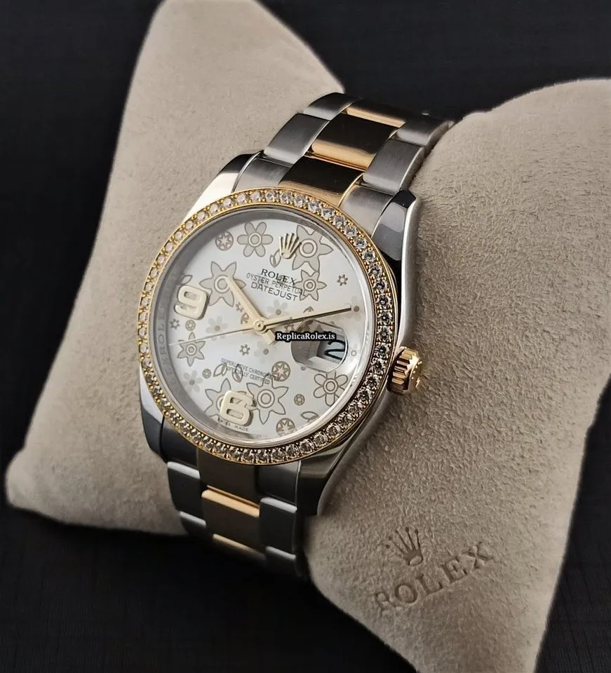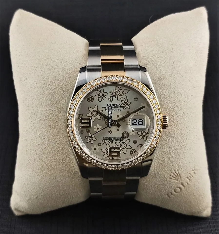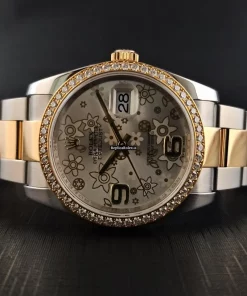 Tags: 10m atm, 116243, 31 jewels, 36mm case diameter, 48h power reserve, automatic movement, caliber 3135, fold clasp, gold/steel bracelet color, gold/steel bracelet material, gold/steel clasp material, no numerals, sapphire crystal, silver dial, steel case material, womens watches, yellow gold bezel material