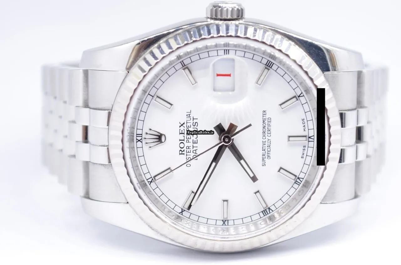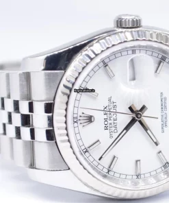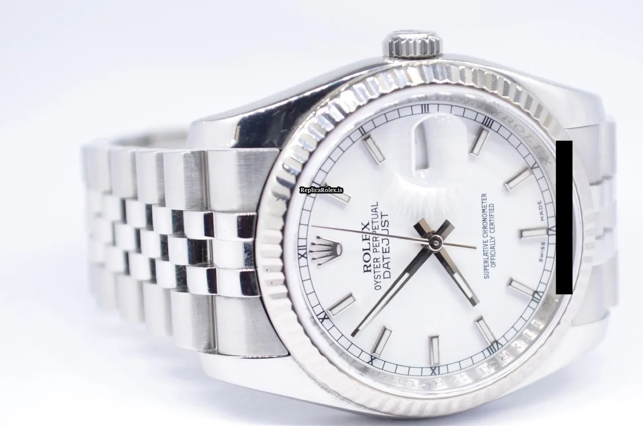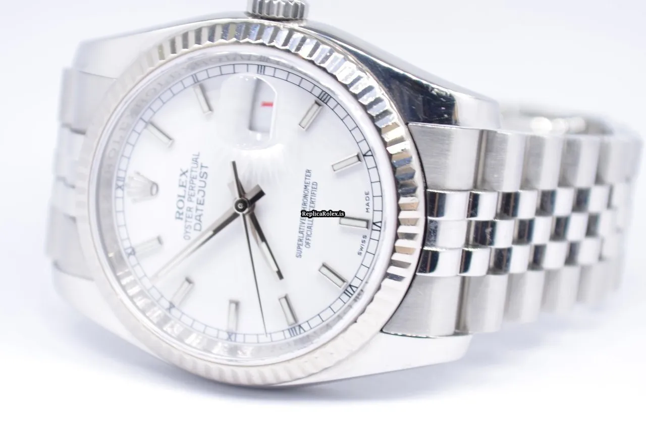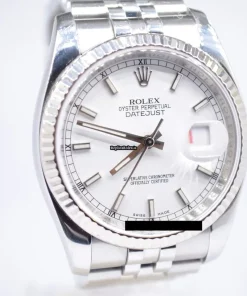 Tags: 10m atm, 116234, 31 jewels, 36mm case diameter, 48h power reserve, automatic movement, caliber 3135, fold clasp, mens watches, sapphire crystal, steel bracelet color, steel bracelet material, steel case material, steel clasp material, unisex watches, white dial, white gold bezel material