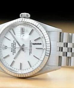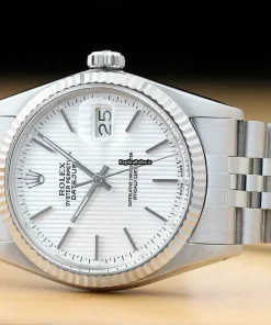 Tags: 16014, 191mm bracelet length, 20mm lug width, 27 jewels, 36mm case diameter, automatic movement, caliber 3035, mens watches, plexiglass crystal, silver dial, steel bracelet color, steel bracelet material, steel case material, unisex watches, white gold bezel material