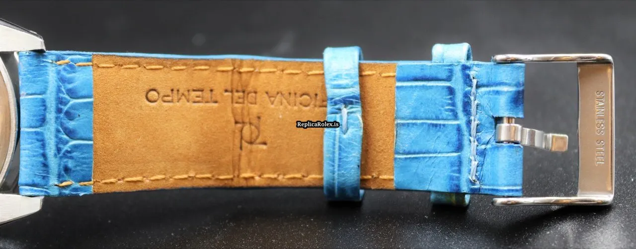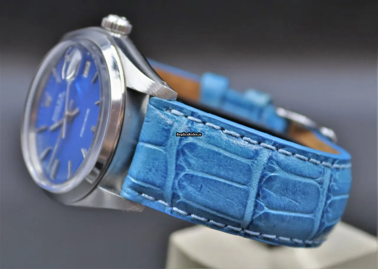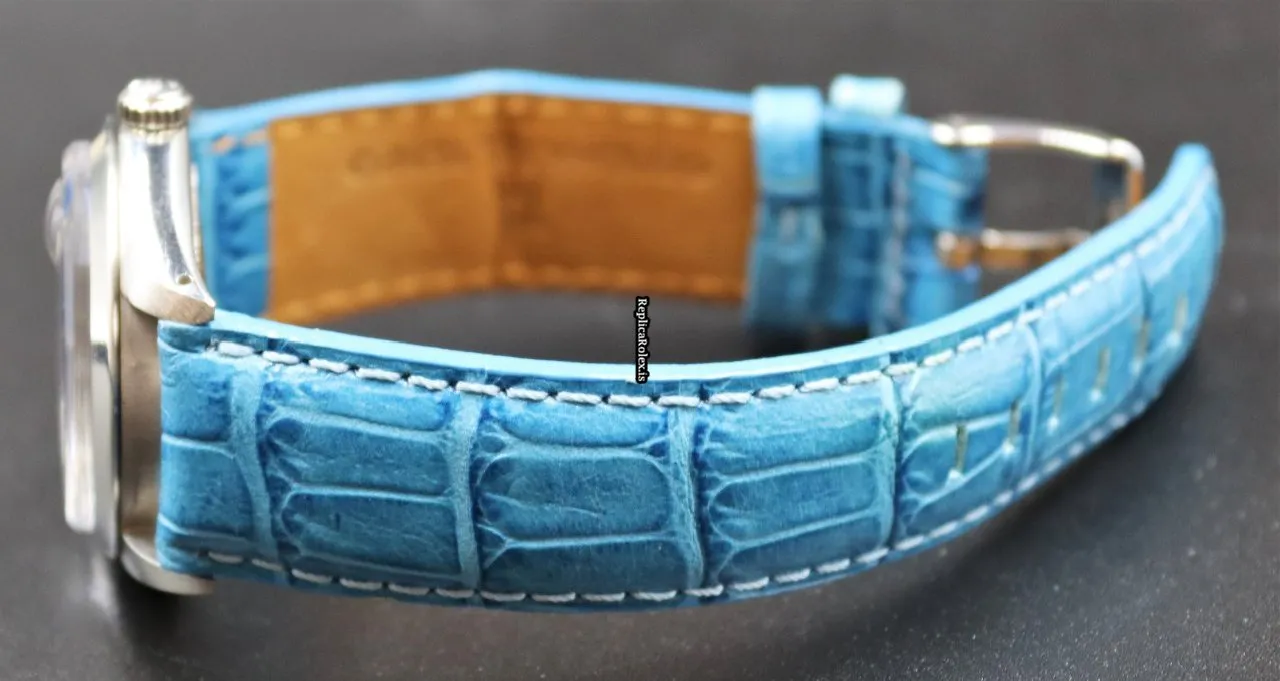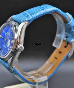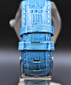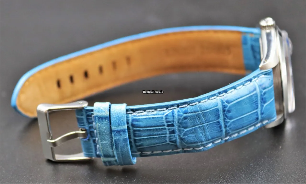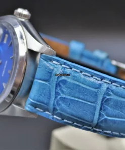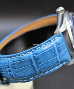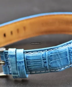 Tags: 17 jewels, 34mm case diameter, 3m atm, 40h power reserve, 6694, blue bracelet color, blue dial, buckle clasp, caliber 1225, leather bracelet material, manual winding movement, no numerals, plexiglass crystal, steel bezel material, steel case material, steel clasp material, womens watches