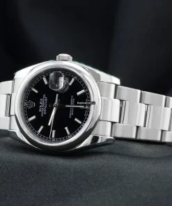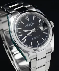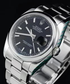Tags: 10m atm, 116200, 31 jewels, 36mm case diameter, 48h power reserve, automatic movement, black dial, caliber 3135, fold clasp, mens watches, no numerals, sapphire crystal, steel bezel material, steel bracelet color, steel bracelet material, steel case material, steel clasp material, unisex watches