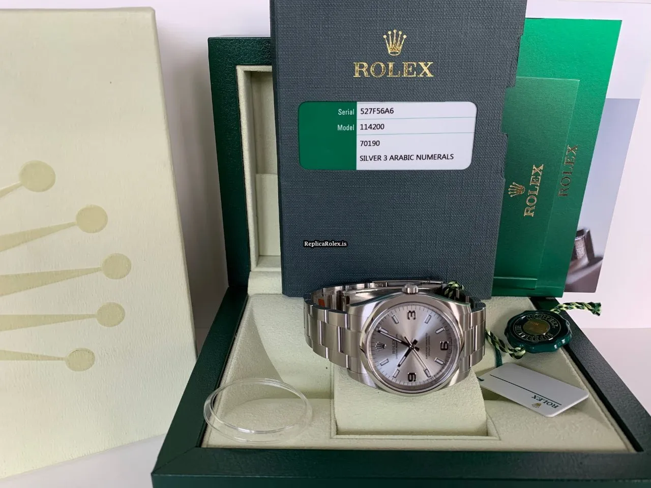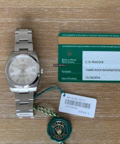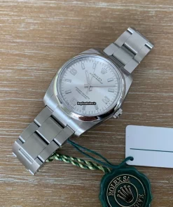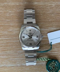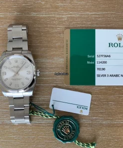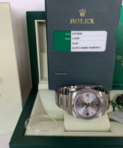 Tags: 10m atm, 114200, 31 jewels, 34mm case diameter, 48h power reserve, arabic numerals, automatic movement, caliber 3130, fold clasp, mens watches, sapphire crystal, silver dial, steel bezel material, steel bracelet color, steel bracelet material, steel case material, steel clasp material, unisex watches