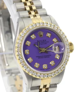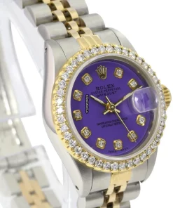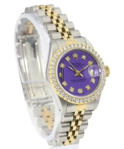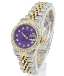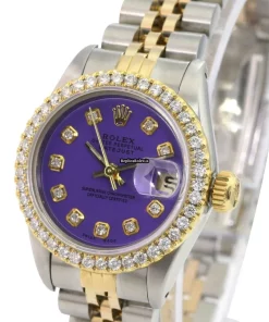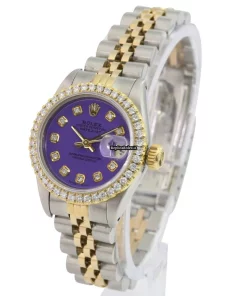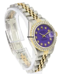 Tags: 10m atm, 26mm case diameter, 29 jewels, 40h power reserve, 69173, automatic movement, caliber 2135, fold clasp, gold/steel bracelet color, gold/steel bracelet material, gold/steel case material, no numerals, purple dial, sapphire crystal, steel clasp material, womens watches, yellow gold bezel material