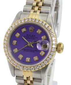 Tags: 10m atm, 26mm case diameter, 29 jewels, 40h power reserve, 69173, automatic movement, caliber 2135, fold clasp, gold/steel bracelet color, gold/steel bracelet material, gold/steel case material, no numerals, purple dial, sapphire crystal, steel clasp material, womens watches, yellow gold bezel material