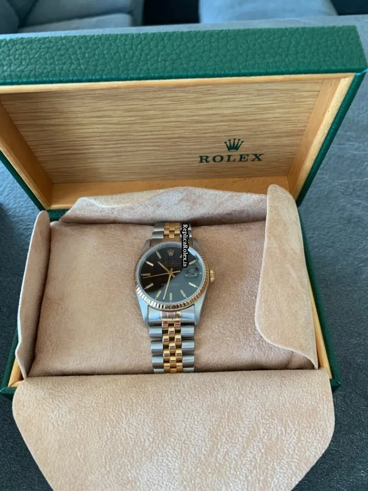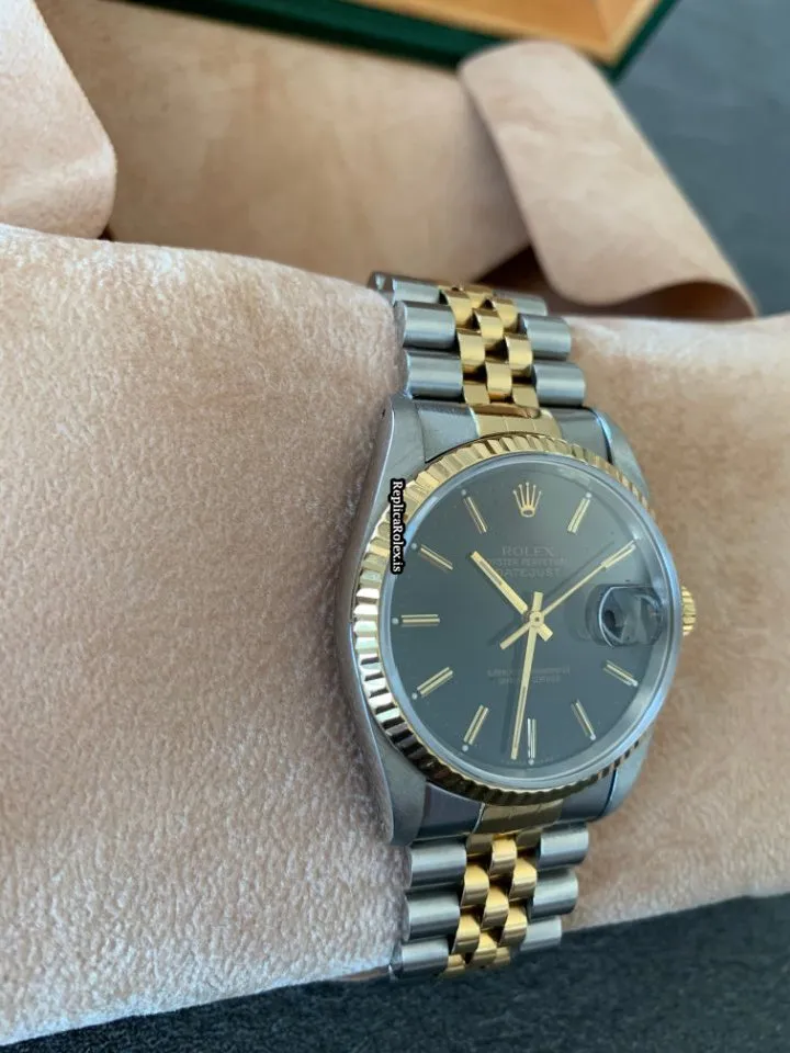 Tags: 10m atm, 16233, 31 jewels, 36mm case diameter, 42h power reserve, automatic movement, black dial, caliber 3135, fold clasp, gold/steel bracelet color, gold/steel bracelet material, gold/steel case material, mens watches, no numerals, sapphire crystal, steel clasp material, unisex watches, yellow gold bezel material