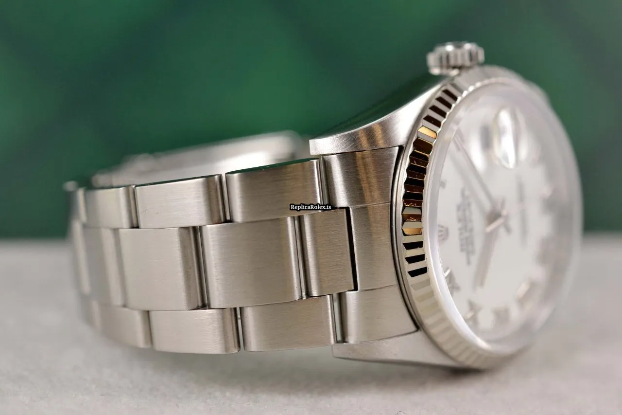 Tags: 10m atm, 16234, 31 jewels, 36mm case diameter, 42h power reserve, automatic movement, caliber 3135, fold clasp, mens watches, no numerals, sapphire crystal, steel bracelet color, steel bracelet material, steel case material, steel clasp material, unisex watches, white dial, white gold bezel material