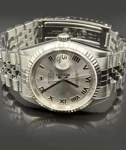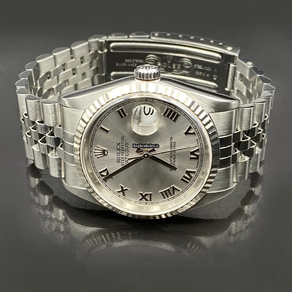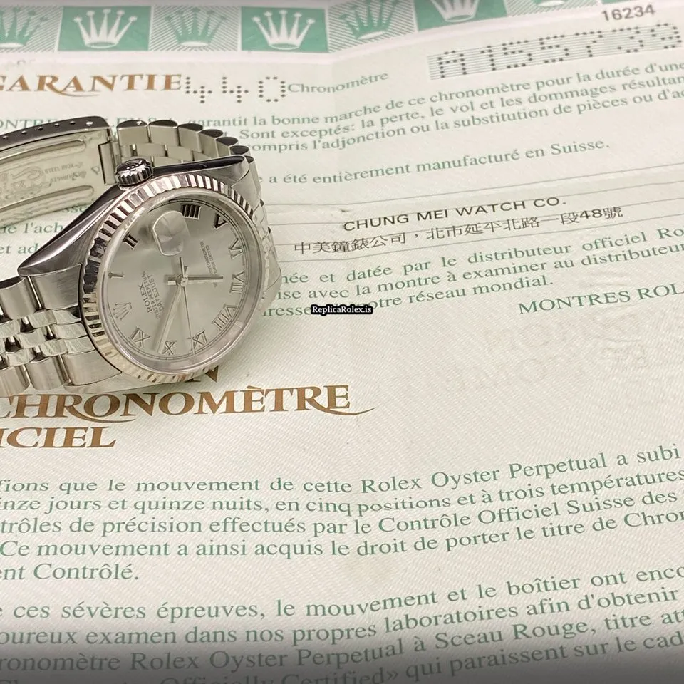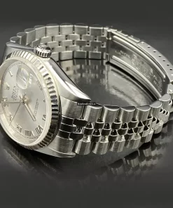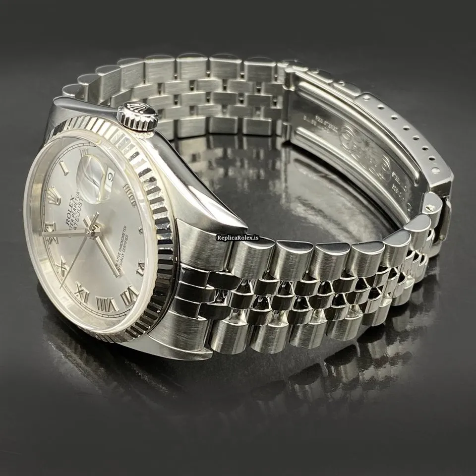 Tags: 10m atm, 16234, 31 jewels, 36mm case diameter, 42h power reserve, automatic movement, caliber 3135, fold clasp, no numerals, sapphire crystal, steel bracelet color, steel bracelet material, steel case material, steel clasp material, white dial, white gold bezel material, womens watches