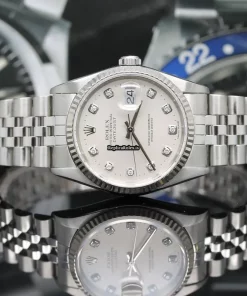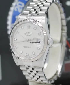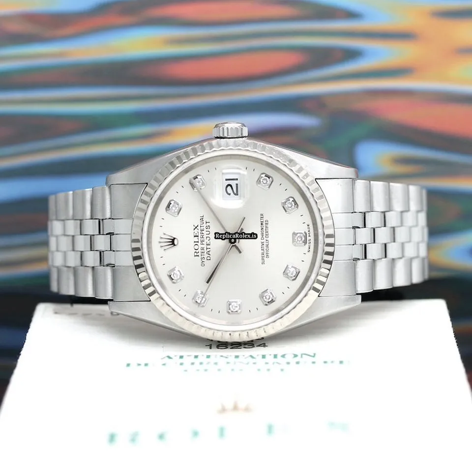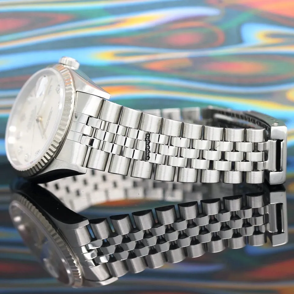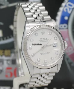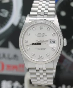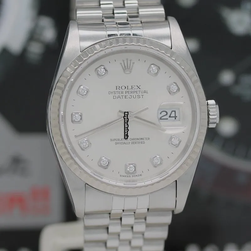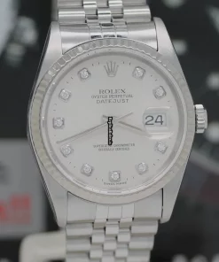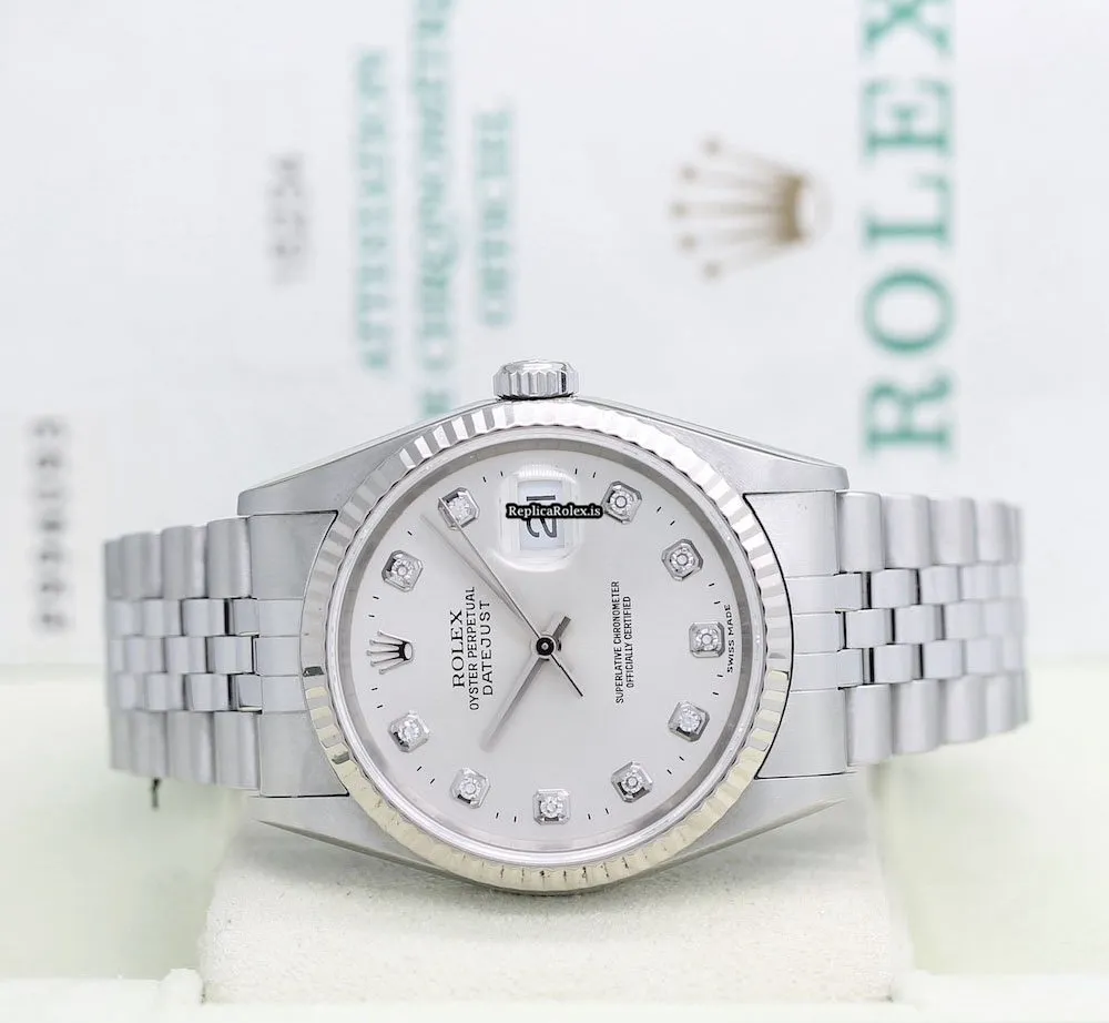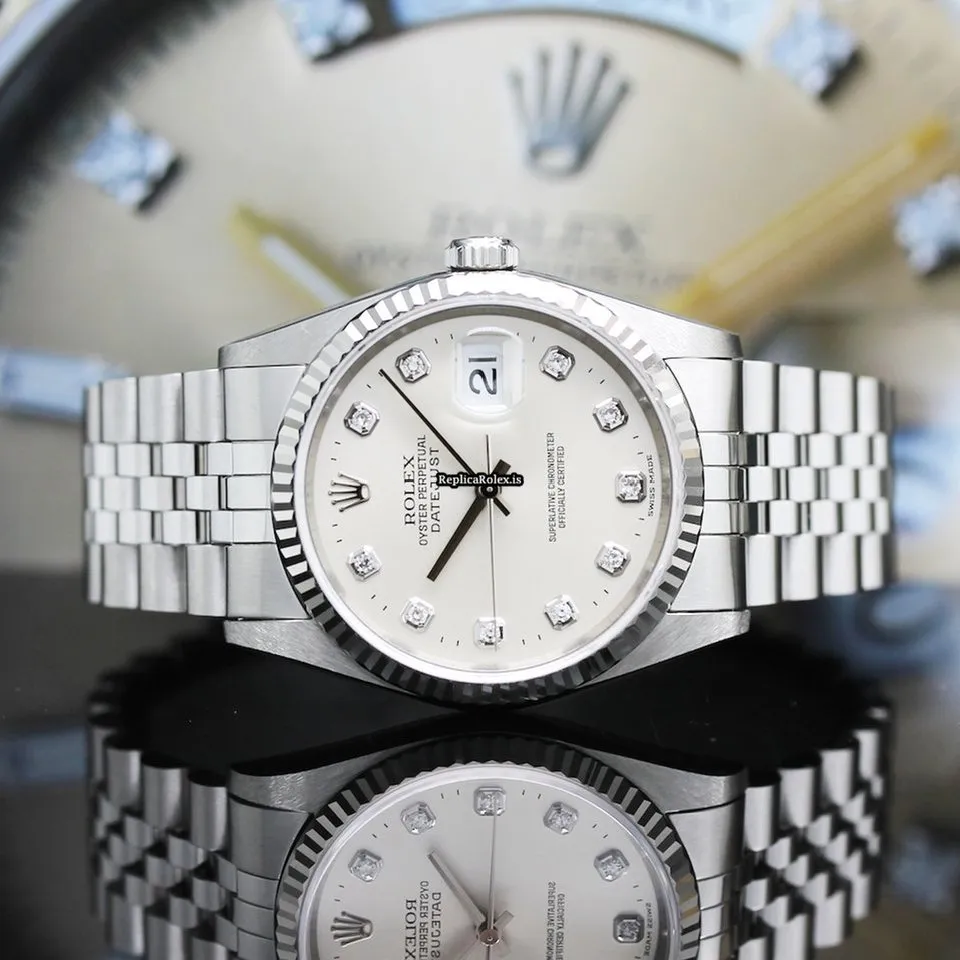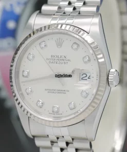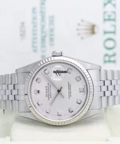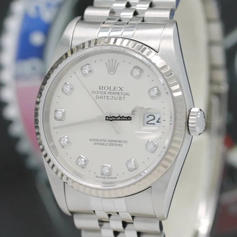 Tags: 10m atm, 12mm, 16234, 31 jewels, 36mm case diameter, 42h power reserve, automatic movement, caliber 3135, fold clasp, mens watches, no numerals, sapphire crystal, silver dial, steel bracelet color, steel bracelet material, steel case material, steel clasp material, unisex watches, white gold bezel material