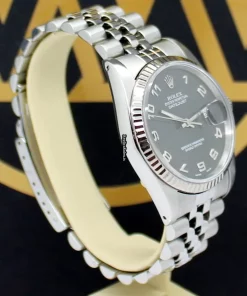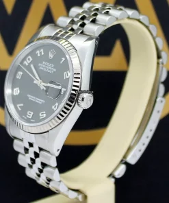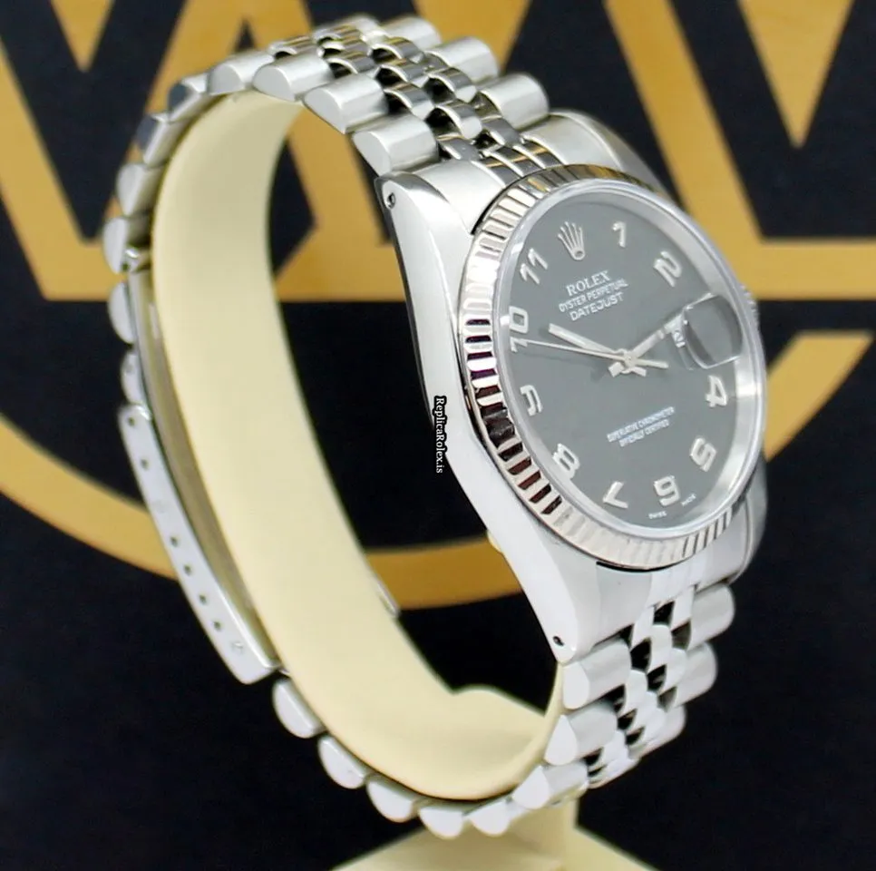 Tags: 10m atm, 16234, 20mm lug width, 31 jewels, 36mm case diameter, arabic numerals, automatic movement, black dial, caliber 3135, fold clasp, mens watches, sapphire crystal, steel bracelet color, steel bracelet material, steel case material, steel clasp material, unisex watches, white gold bezel material