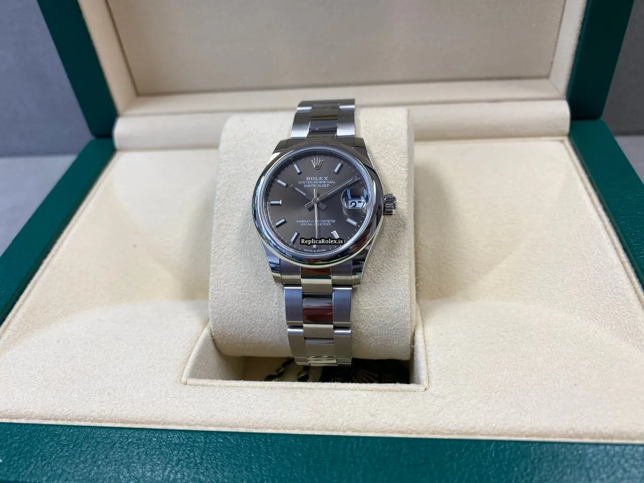 Tags: 10m atm, 278240-0010, 31mm case diameter, 55h power reserve, automatic movement, caliber 2236, fold clasp, grey dial, no numerals, sapphire crystal, steel bezel material, steel bracelet color, steel bracelet material, steel case material, steel clasp material, womens watches