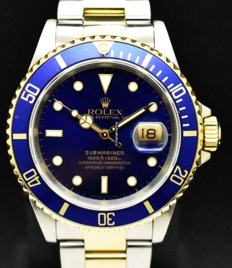Tags: 16613, 30m atm, 31 jewels, 40mm case diameter, 48h power reserve, automatic movement, blue dial, caliber 3135, fold clasp, gold/steel bracelet color, gold/steel bracelet material, gold/steel case material, mens watches, no numerals, sapphire crystal, unisex watches, yellow gold bezel material