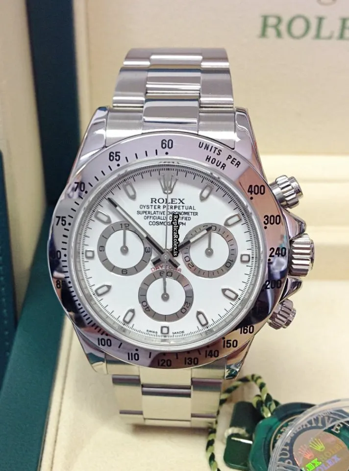 Tags: 10m atm, 116520, 40mm case diameter, 44 jewels, 72h power reserve, automatic movement, caliber 4130, fold clasp, mens watches, no numerals, sapphire crystal, steel bezel material, steel bracelet color, steel bracelet material, steel case material, steel clasp material, unisex watches, white dial