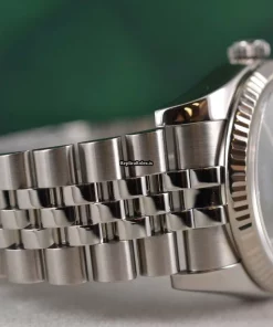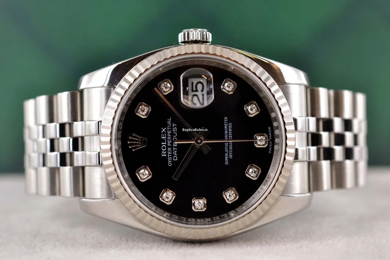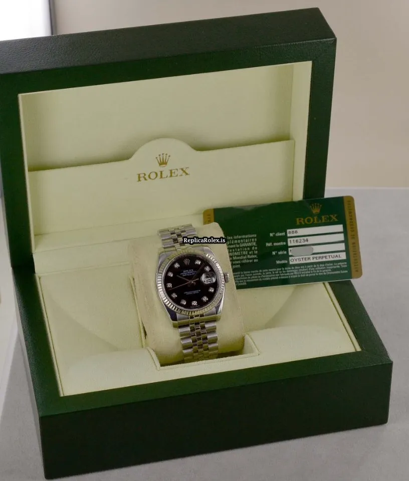 Tags: 10m atm, 116234, 31 jewels, 36mm case diameter, 48h power reserve, automatic movement, black dial, caliber 3135, fold clasp, mens watches, sapphire crystal, steel bracelet color, steel bracelet material, steel case material, steel clasp material, unisex watches, white gold bezel material