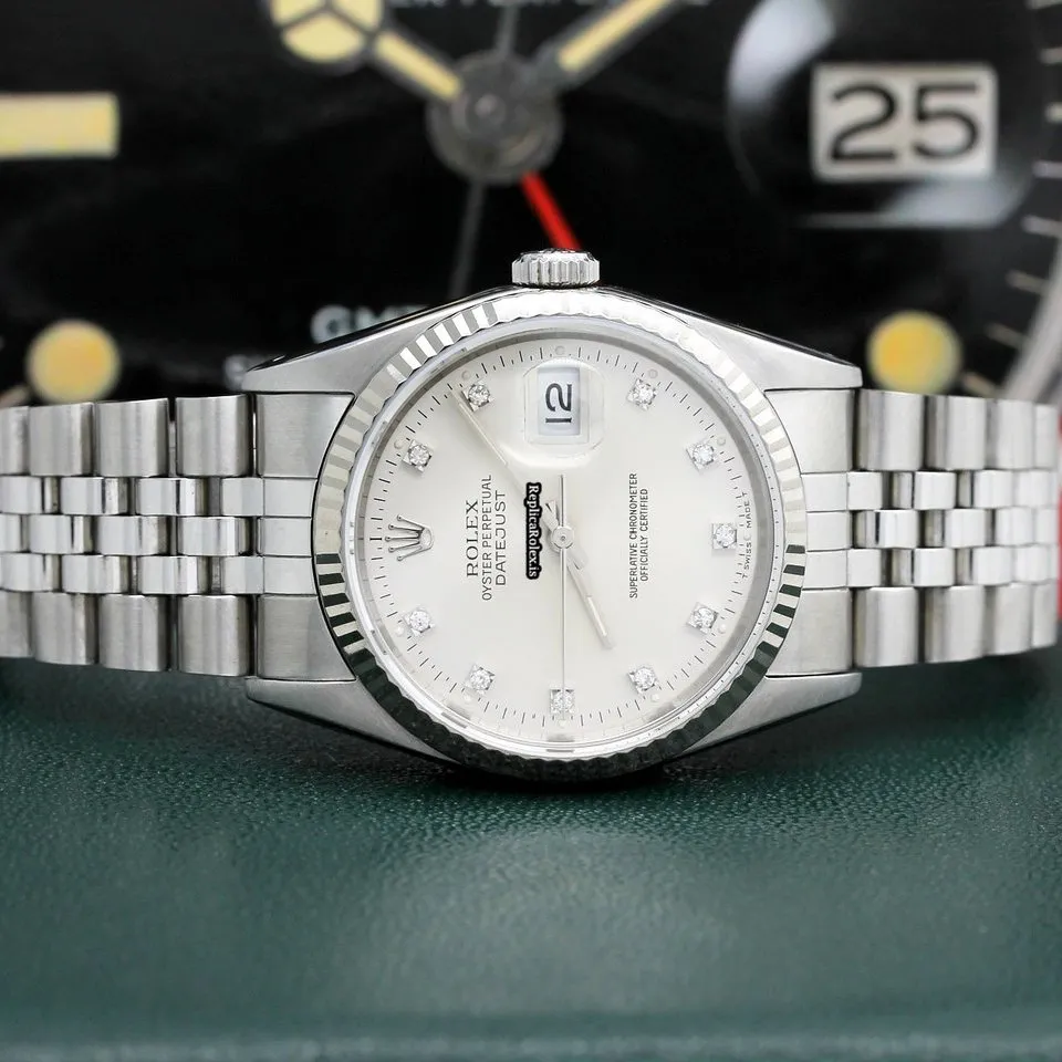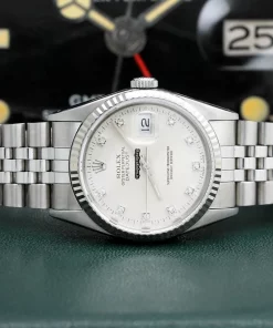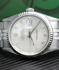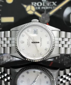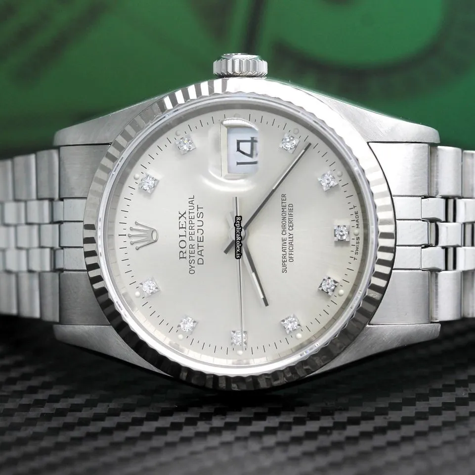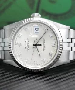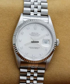 Tags: 10m atm, 12mm, 16234, 31 jewels, 36mm case diameter, 42h power reserve, automatic movement, caliber 3135, fold clasp, mens watches, no numerals, sapphire crystal, silver dial, steel bracelet color, steel bracelet material, steel case material, steel clasp material, unisex watches, white gold bezel material