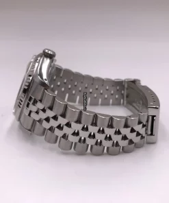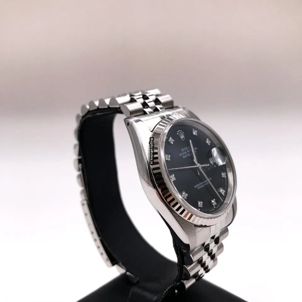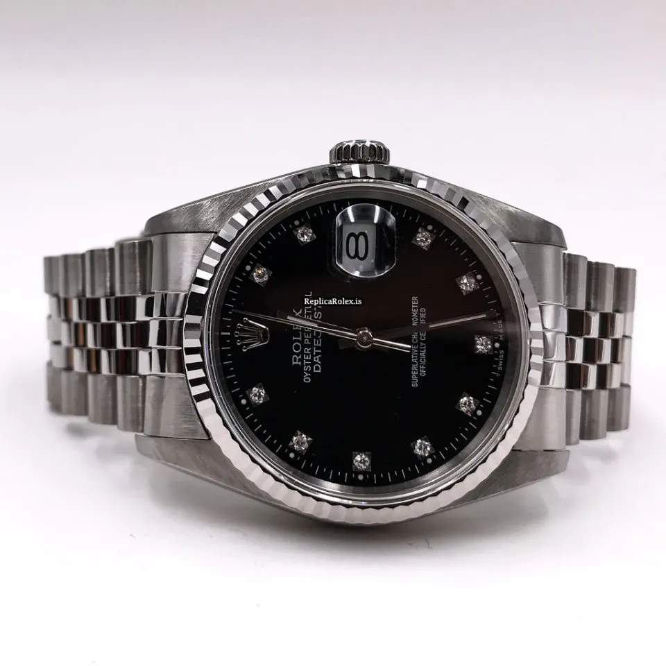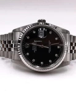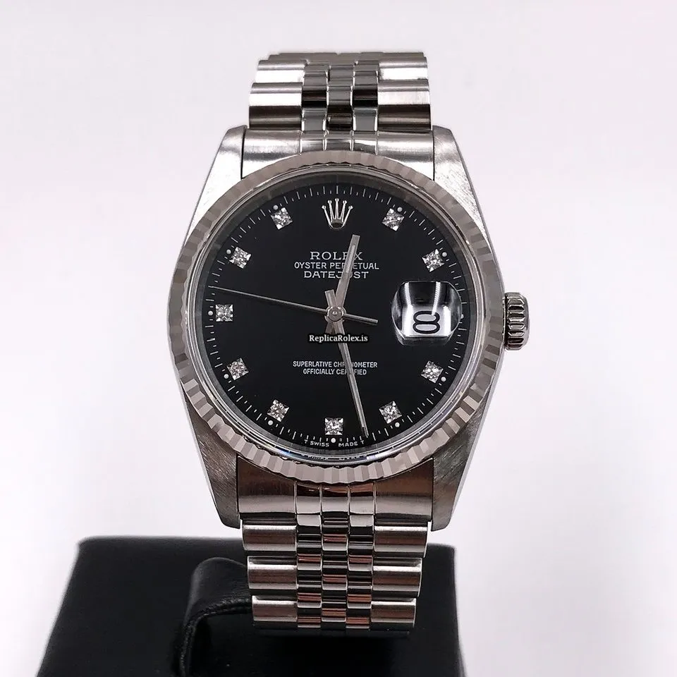 Tags: 10m atm, 16234g, 31 jewels, 36mm case diameter, 42h power reserve, automatic movement, black dial, caliber 3135, fold clasp, mens watches, no numerals, sapphire crystal, steel bracelet color, steel bracelet material, steel case material, steel clasp material, unisex watches, white gold bezel material